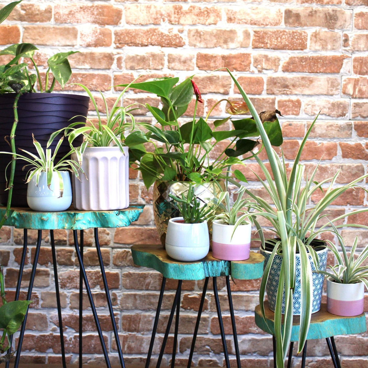 Wooden Plant Stands, they stand on hairpin legs with a solid wood on top. These stands look great on their own or tiered into groups and are also very useful as side or occasional tables. The hairpin is polished with black Iron paste to give that smooth finish, which makes them sturdy and lightweight.