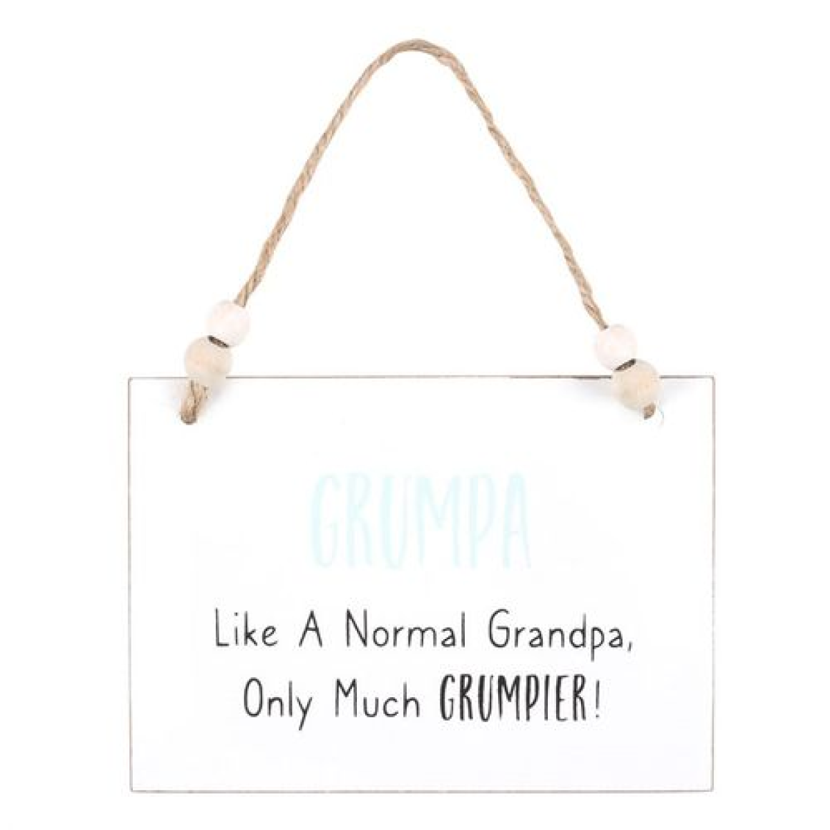 The perfect token gift for family and friends, this white wooden hanging sign features the text 'Grumpa. Like a normal grandpa, only much grumpier!'. Approximately 10cm x 14cm with twine hanger and finished with a wooden beads.