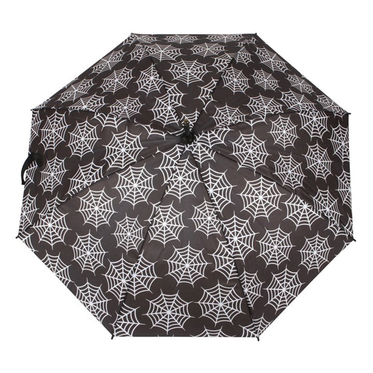 Keep dry while adding a touch of arachnid-inspired flair to any rainy day ensemble with this all over spider web printed umbrella. Dark and spooky, his umbrella is sure to catch you in its web!