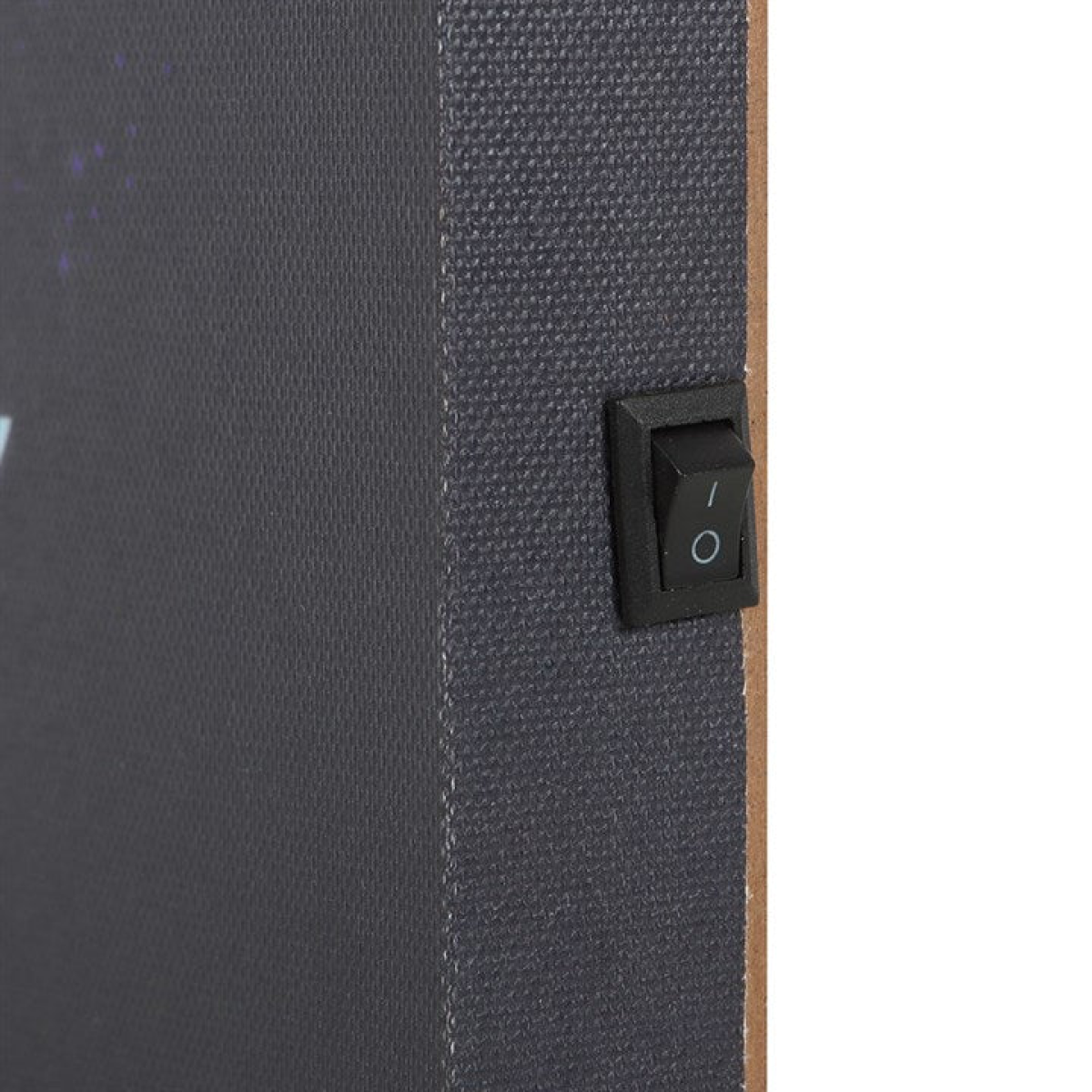 Add a touch of magic to your space with this 30x30cm light-up wall canvas. Features a mystical moth and plant design with embedded LED lights to create a mesmerizing glow. Please note that the switch is located on the side of the canvas and may be slightly obscured by the packaging upon delivery. Requires 2 x AA batteries. Designed by SDC Wholesale and part of the Night Flight range of mystical owl gifts and home decor.