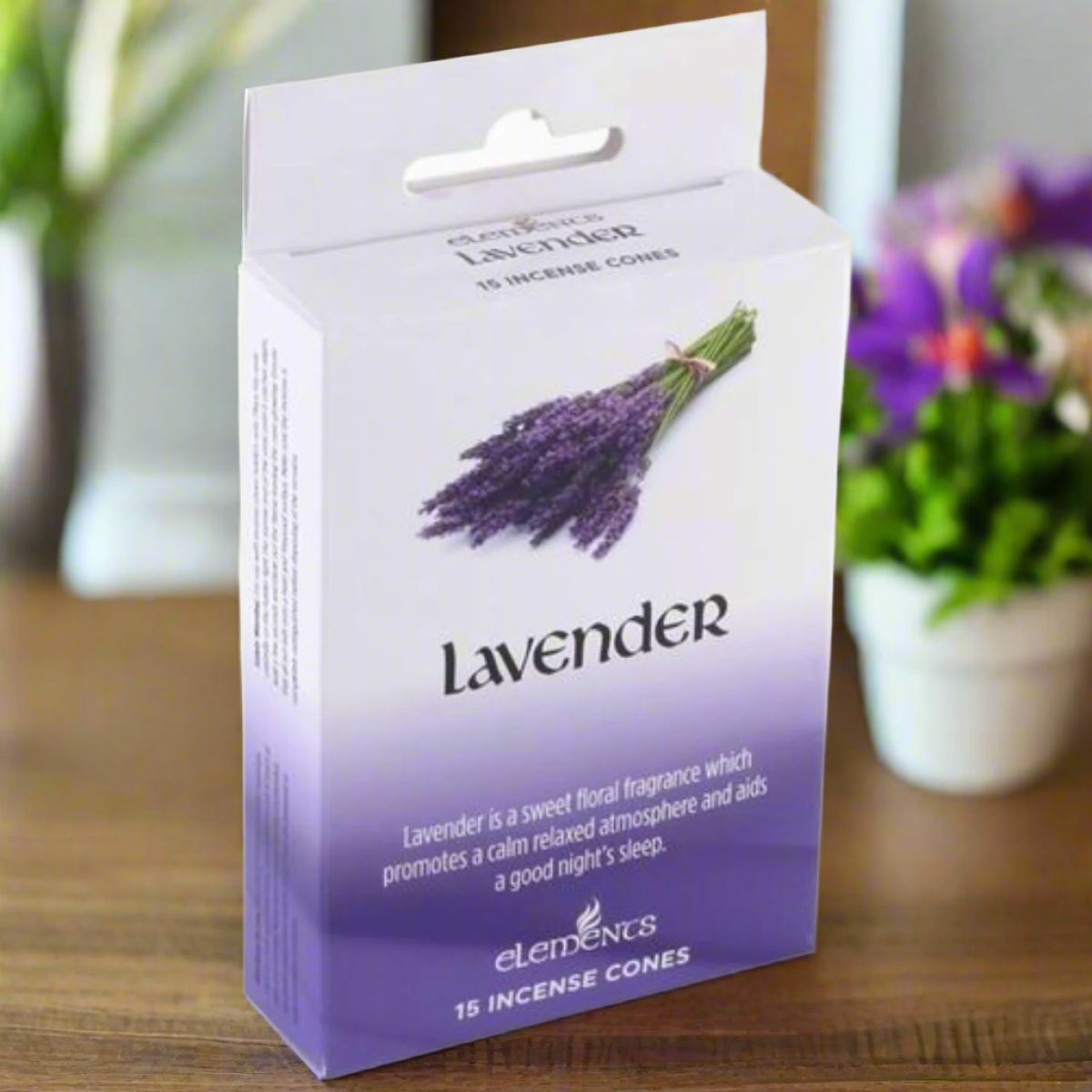 A display box of 12 packs of Lavender fragranced incense cones by Elements. Each pack contains 15 incense cones. Comes with a small round metal cone holder. Product Dimensions: H12.5cm x W7.5cm x D2.5cm Packaged Dimensions: H13cm x W15cm x D15.5cm