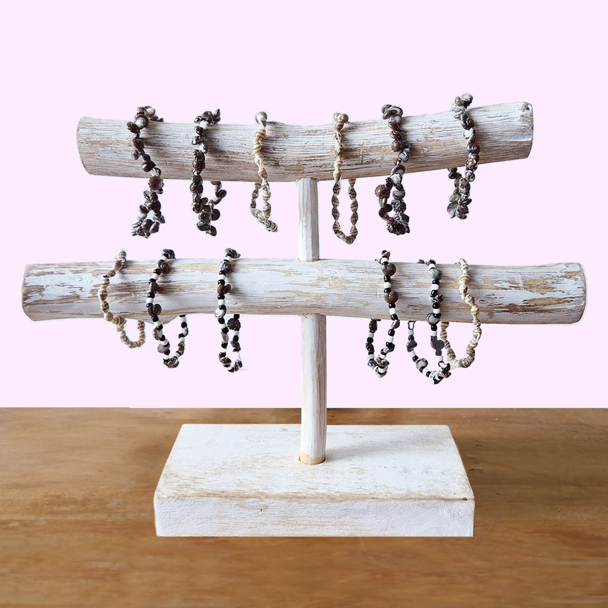 Bracelet features natural Raffa, pinewood beads, and driftwood accents, carefully crafted in Indonesia. Each lightweight 2-gram bracelet showcases a cowrie shell design, adding a rustic, organic touch to everyday wear. Ideal for gifting or personal style, these bracelets offer a subtle way to celebrate connection through artisanal craftsmanship.