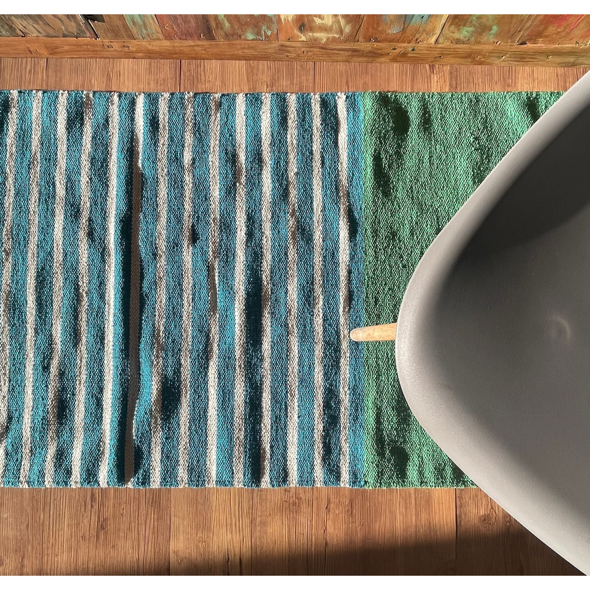 Yoga mat sized green Indian Cotton Rug is ideal for halls, bathrooms, home décor or yoga. Made with 100% Indian cotton by a family business in Panipat. This small city, north of Delhi is known of weavers and famous for its hand crafted textiles.