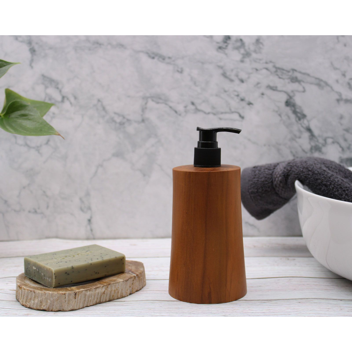 Elevate your customer’s home with these sleek and sophisticated teakwood soap dispensers. They are lovingly made in the heart of Java villages from carefully managed teak reserves With a little bit of care, these soap dispensers will serve your customers for years. This soap dispenser has a sturdy pump. This reusable soap dispenser has a capacity of 200 ml. The pump and bottle inside that hold liquid soaps is made of plastic.