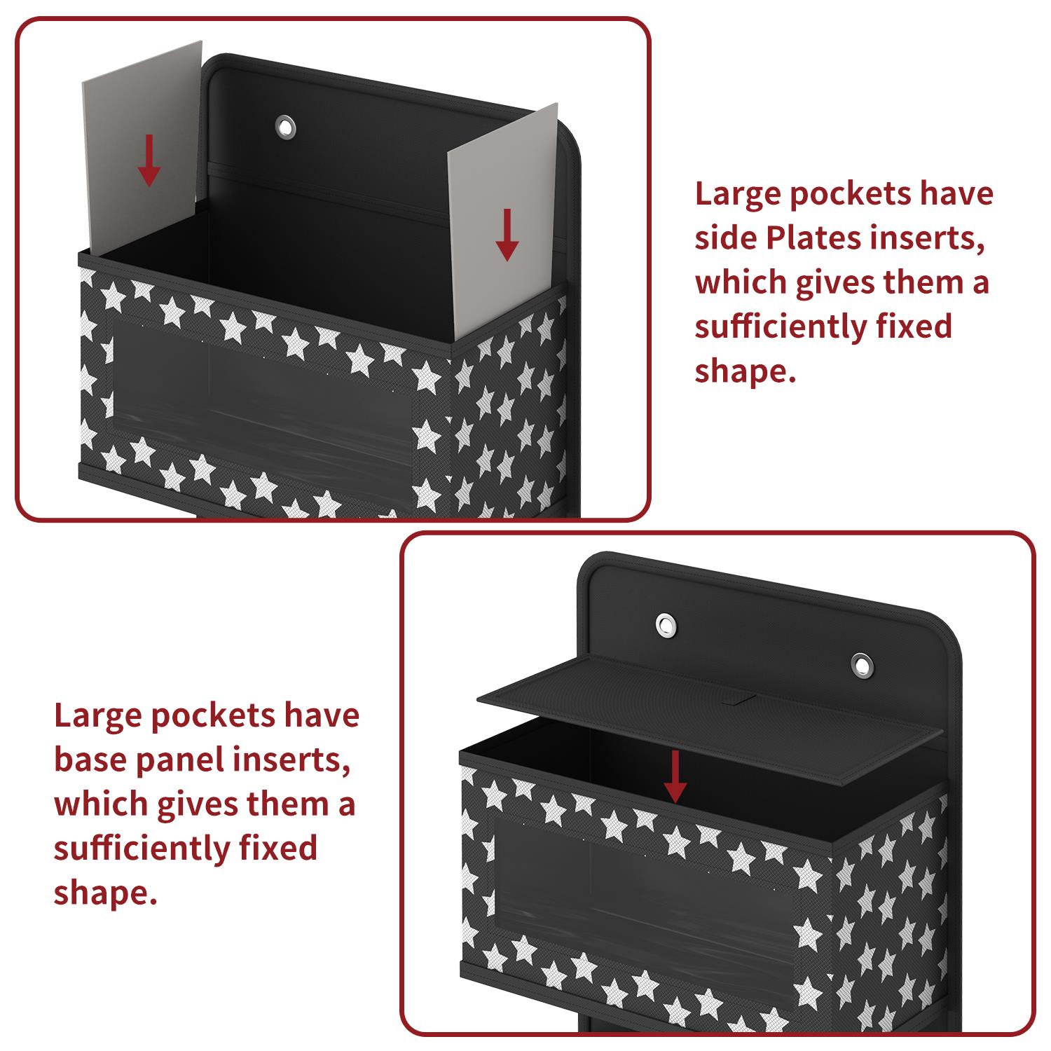 EASY INSTALLATION: Simply stuff the cardboard plates into each pocket and hook it to the door to create vertical storage space. This set includes two metal hooks, side and base plates for the bottom of all pockets to give them a strong enough shape and to aid in the storage of items. Over the door hanging storage can be hung not only on doors and shelves, but also on the wall with nails or through the wear-resistant holes in the hooks.
