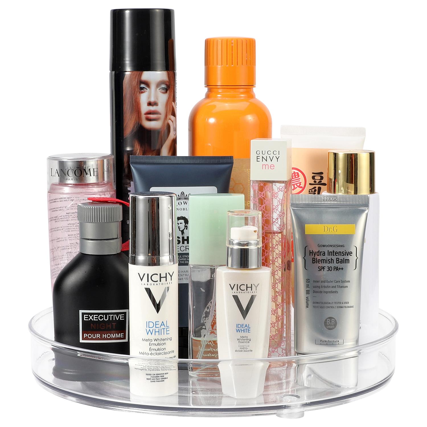 CLEAR & HIGH EDGE DESIGN: The open design of this transparent organizer allows you to see and extract the contents easily and the 3.5cm edge helps to avoid bottles from tumbling off the tray when it is rotated.