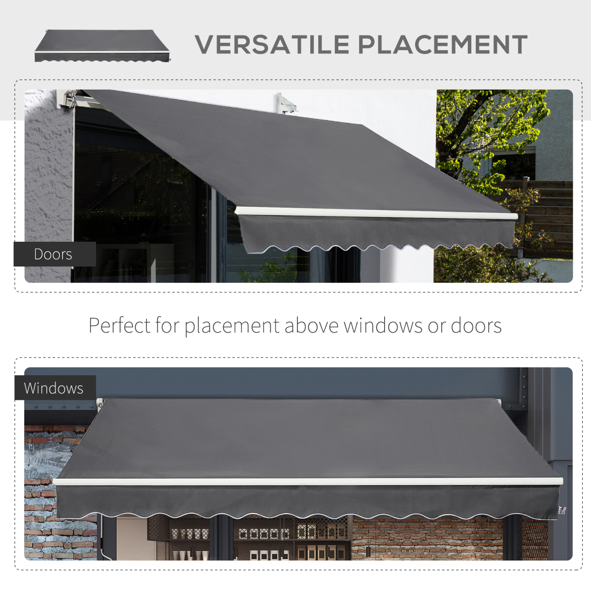 With a thick sun-shielding canopy fixed on an aluminium frame, this 4 x 2.5m awning from Outsunny will give you all the shade you need this season. The manual design means you can set it up wherever needed - whether it's above a door or window, and it easily mounts onto your chosen surface with all accessories included in the package. Finished with a crank handle for easy operation. It's time to enjoy the beauty of the Summer more than ever before.