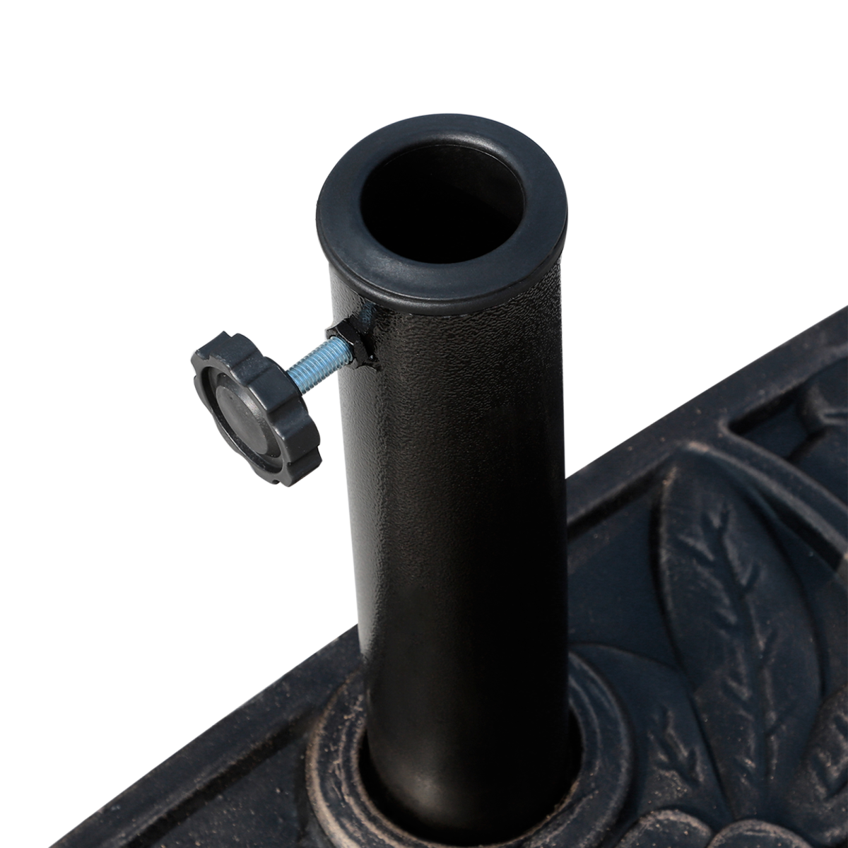 This Outsunny half round parasol base is a great accessory to have to accompany your half round parasol. Design to work perfectly this this type of parasol, it will be able to reduce the amount of space it takes. The base has a flower pattern to suit any outdoor setting, it holds the umbrella pole securely and evenly in place. This is a necessary item to have to complete your outdoor setting.