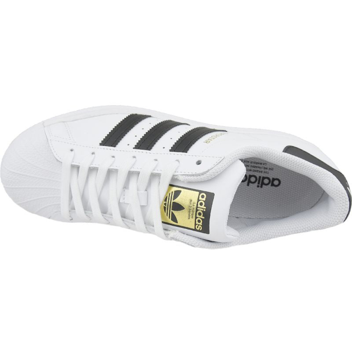 what distinguishes Superstars from other shoes are, of course: a rubber toe cap resembling a shell, 3 stripes on the sides characteristic of the Adidas brand and a golden Originals logo on the tongue