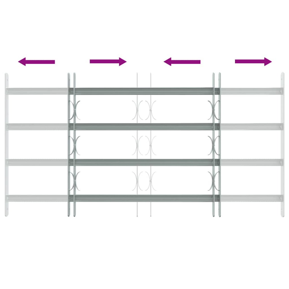 This security grille is manufactured to a high standard in order to increase the security of your house or office. Made of solid galvanised steel, this security grille with 4 crossbars is sturdy and durable, to effectively protect your property from burglary. With the decorative elements, the window grille also adds a touch of style to your house. This security grille can be installed horizontally with its adjustment in width from 700-1050 mm to fit a variety of windows. Our window grille is not only a high security option, but also a piece of fine workmanship. Assembly is easy. Delivery also includes mounting accessories.