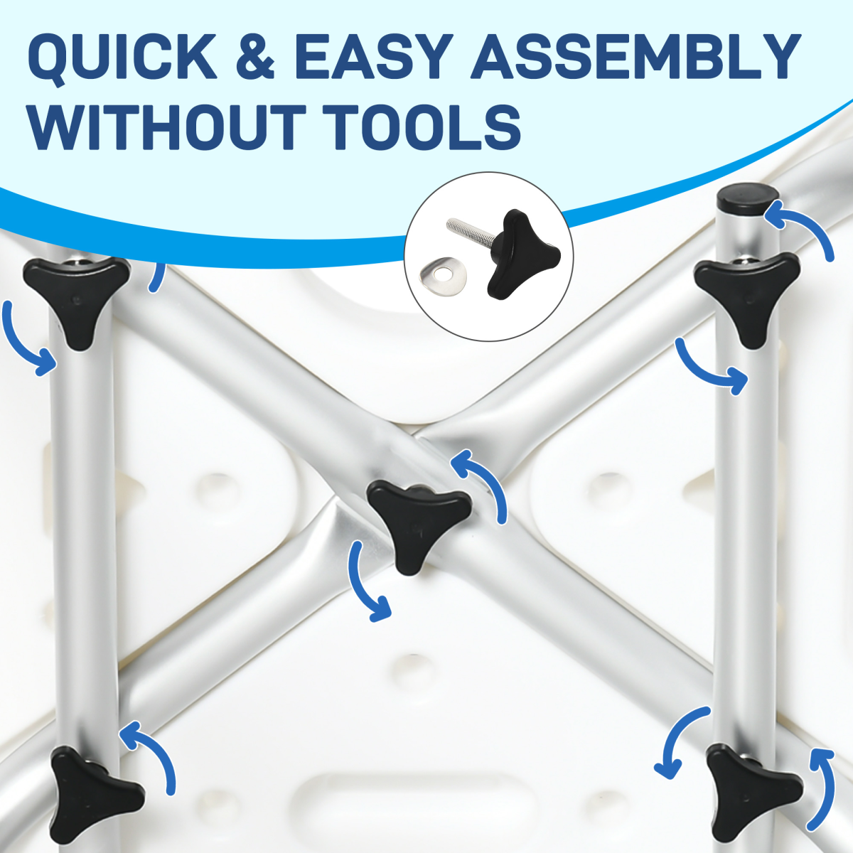 Six-level adjustable height seat: A bath stool which can be used by many different people. User can sit at a height most comfortable for them.Comfortable: Ergonomic bath seat features a textured seat, high back and tall padded arms. 'U' cut out on edge of seat for personal hygiene. Holes in seat for water drainage.Aluminium frame, with four suction feet: Strong metal core, this bath chair supports the body when being used. Feet secure chair to the ground, even when wet.Bath and shower assistance: This is a bath seat for elderly, disabled, pregnant and those who require assistance when washing. Top handle to move it easily.Dimensions: 70-82H x 54W x 52Dcm. Seat: 43.5W x 32.5Dcm. Maximum load 136kg.