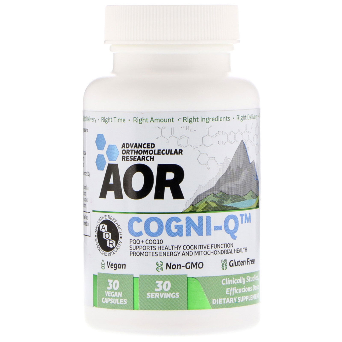 Right Amount Right Ingredients Right Delivery Right Time AOR - Innovative Research - Scientific Integrity Supports Healthy Cognitive Function Promotes Energy and Mitochondrial Health Vegan Non-GMO Gluten Free 30 Servings Clinically Studied, Efficacious Dose Dietary Supplement GMP Manufacturing Independent Testing Quality Assured Discussion: Cogni-Q provides pyrroloquinoline quinone (PQQ) and coenzyme Q10 (CoQ10) to support healthy cognitive function and provides powerful antioxidants.