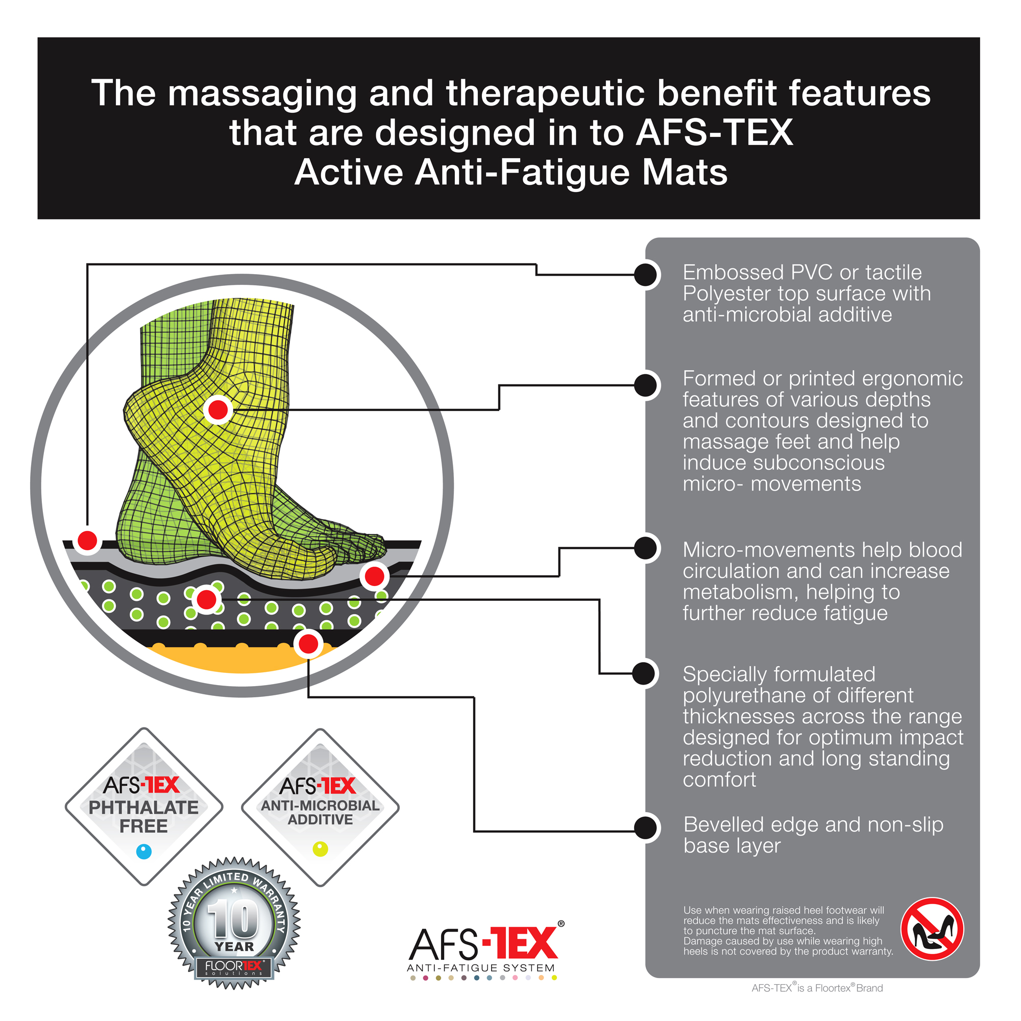 AFS-TEX Active Anti-Fatigue mats are designed to provide the ultimate standing surfaces combining prolonged comfort and effective body support. Reduces the strain on feet, legs knees & back joints that can be caused through prolonged standing. The AFS-TEX 2000 incorporates a printed design to encourage the regular changes in standing position. Regular movement stimulates blood flow, increase the body's metabolism and helps with further fatigue relief. Contains anti-microbial content to protect the mat surface from microbial deterioration. Effective 24/7 for the life of the product. Anti-slip base for stability. Non-toxic and phthalate free. Ideal for office or home use.