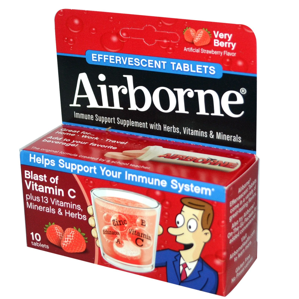 Artificial Strawberry Flavor Immune Support Supplement with Herbs, Vitamins & Minerals Great for Home · Work · Travel Add to Your Favorite Beverage! The Original Formula Created by a School Teacher! Helps Support Your Immune System Blast of Vitamin C - Plus 13 Vitamins, Minerals & Herbs Echinacea, Zinc Vitamin C, E, A Gluten Free No Preservatives 1 Effervescent Tablet = 1,000 mg of Vitamin C High in Antioxidants (Vitamins A, C & E) Excellent Source of Zinc & Selenium 350 mg Herbal Blend including Echinacea & Ginger Airborne Effervescent Tablets come in a variety of great-tasting flavors. Airborne effervescent formula offers fast-acting absorption!