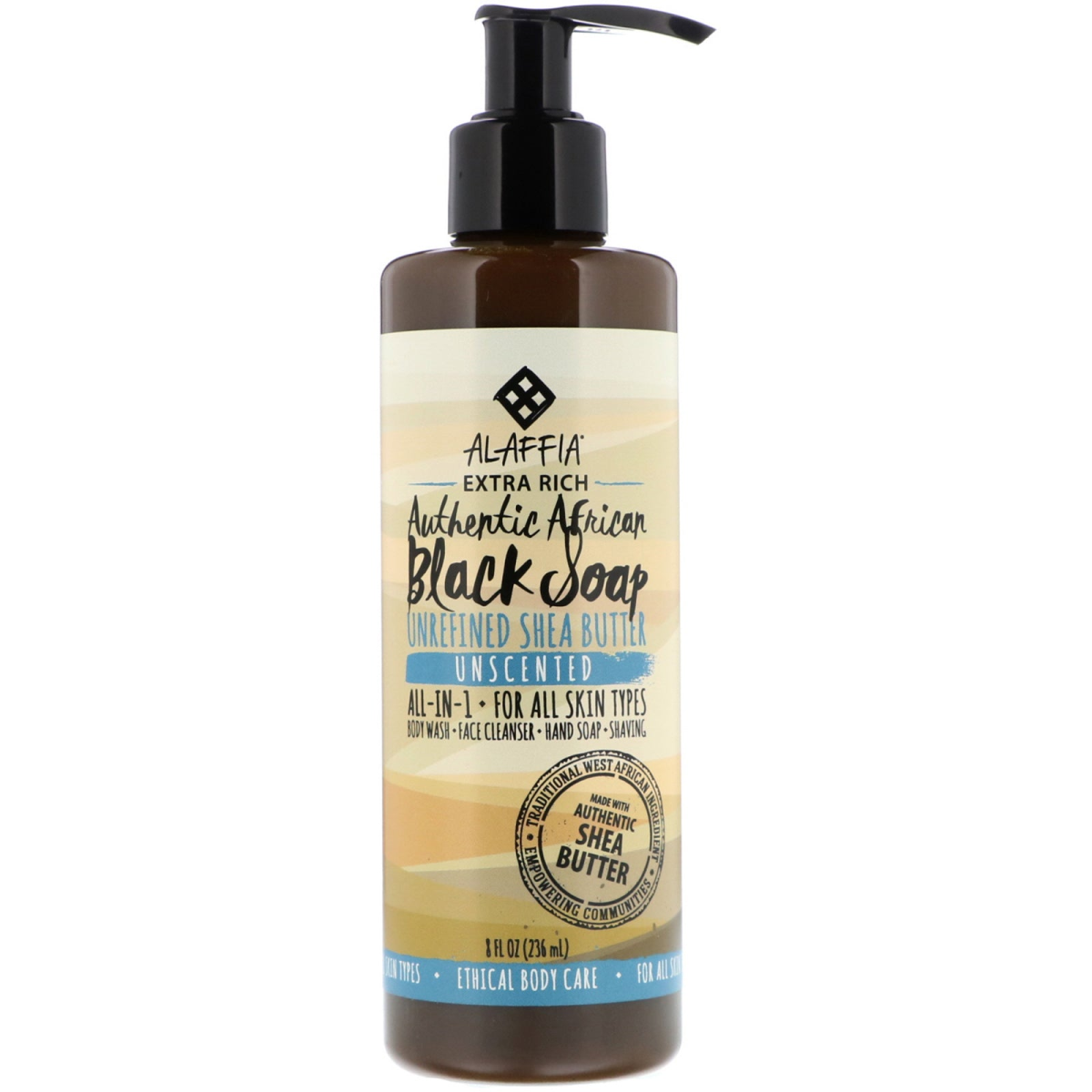 Unrefined Shea Butter All-in-1 For All Skin Types Body Wash | Face Cleanser | Hand Soap | Shaving Made with Authentic Shea Butter Traditional West African Ingredient - Empowering Communities Ethical Trade Vegan No Animal Testing Paraben Free Biodegradable Ingredients Alaffia's Extra Strength Authentic African Black Soap contains extra shea butter and palm oil†for luxurious, deep cleansing and moisturizing. In West Africa, black soap is known by its Yoruba name, Osse Dudu. Dudu means the color "black," which comes from extensive cooking of the soap to the point of charcoal. Many cultures in West Africa use charcoal to detoxify and purify the skin. No chemical preservatives, color enhancers, or synthetic fragrances are used.