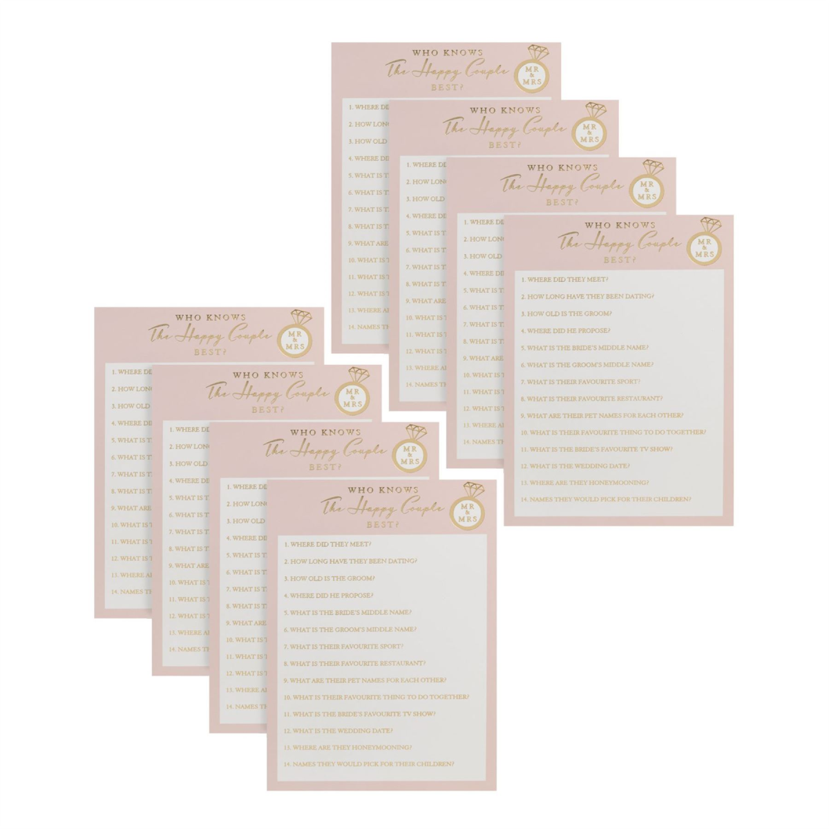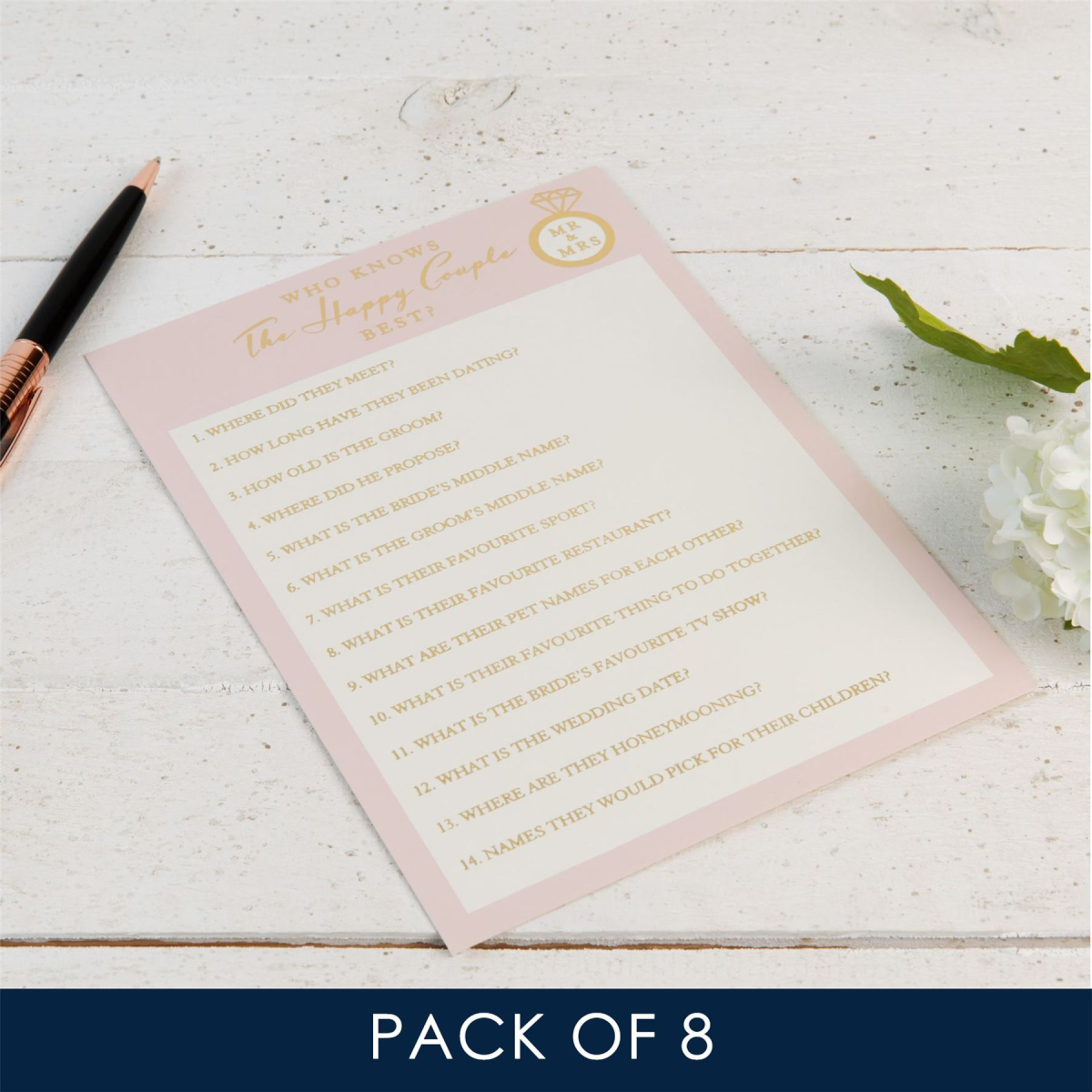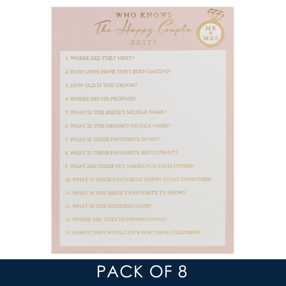 This pack of party game cards make the perfect fun activity for the bridal shower or hen do. The aim of the game is for guests to answer questions about the happy couple to see 'Who knows the happy couple best?' Not only fun for the day but also a great keepsake to look back at years later!