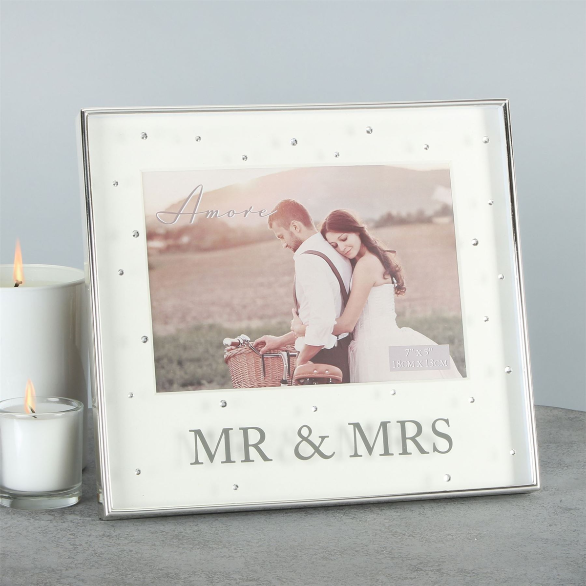 A beautiful silver plated 'Mr & Mrs' frame with crystal embellishment from the AMORE BY JULIANA� Wedding Day Collection. The frame features an attractive silver foil 'Mr & Mrs' design below a 7" x 5" (18x13cm) aperture.