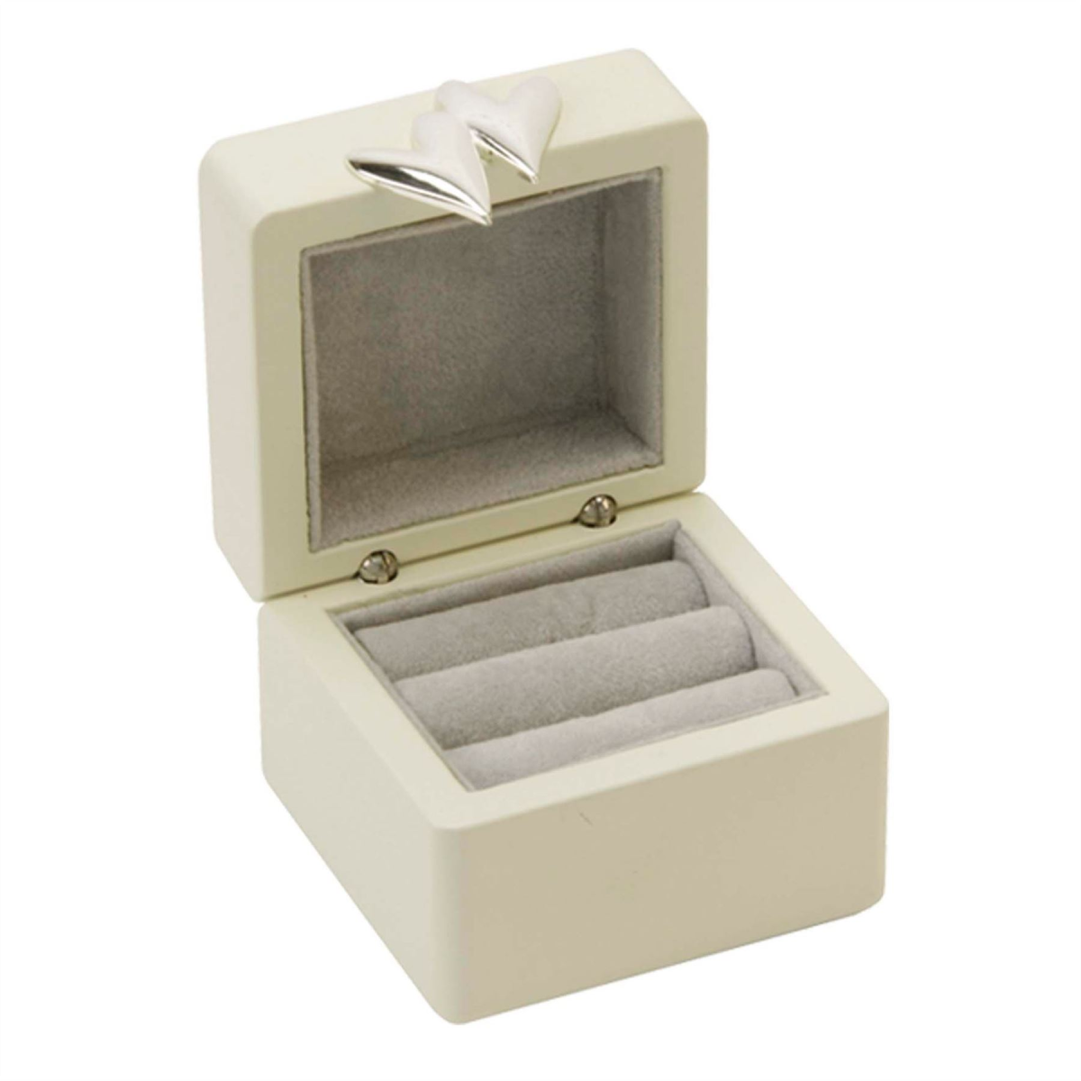 A beautiful brushed aluminium and silver plated AMORE BY JULIANA� wedding ring box. Embellished with intertwined rings with set crystal lid detail, double heart clasp, cushioned velveteen ring roll and complete with luxury foiled presentation box, this makes a stunning gift for the special day.