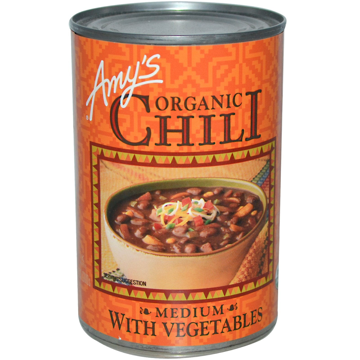 Kosher Pareve No GMOs USDA Ready to Serve Chili is fun food...hearty, substantial and just plain good eating. From its modest beginnings in San Antonio, Texas (before Texas was a state) chili has spread far and wide. Amy's meatless version of this well known dish, made from pure and natural ingredients, prepared with the same care as our popular frozen meals and canned soups, will satisfy chili lovers everywhere. A combination of red beans and vegetables in a great tasting, medium spiced Mexican sauce.