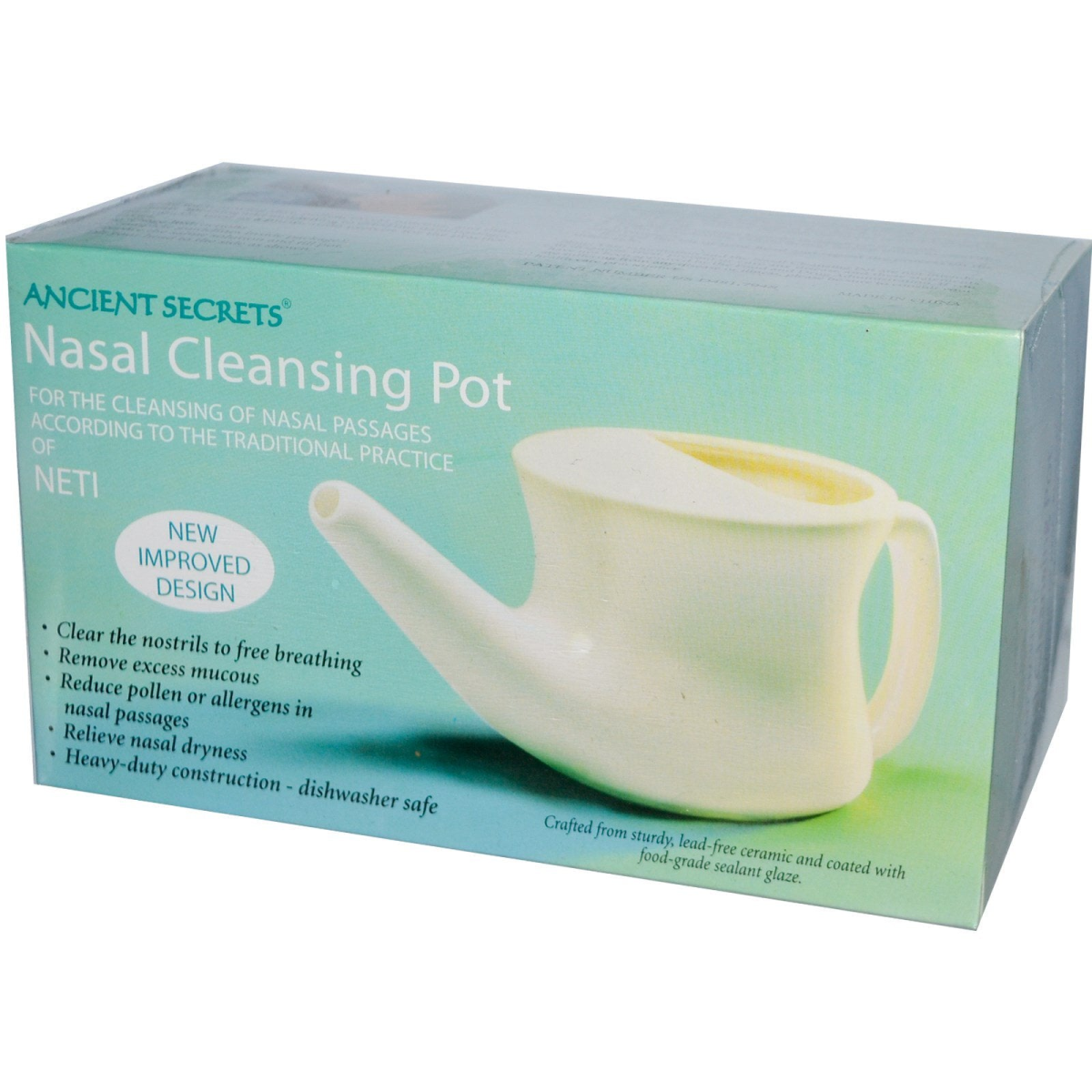 New Improved Design Clear the Nostrils to Free Breathing Remove Excess Mucous Reduce Pollen or Allergens in Nasal Passages Relieve Nasal Dryness Heavy-Duty Construction - Dishwasher Safe Crafted from Sturdy, Lead-Free Ceramic and Coated with Food-Grade Sealant Glaze For the Cleansing of Nasal passages according to the traditional practice of Neti. Ancient Secrets Nasal Cleansing Pot is the ideal answer for cleansing nasal passages. You need only follow the simple directions inside to prepare the saline solution used to rinse through your nostrils. The gentle and effective technique of nasal irrigation is widely recommended by health practitioners worldwide as a wonderful way to improve your overall feeling of well-being and maintain radiant, vibrant health. Many people practice Neti on a daily basis to keep their sinuses clean and improve their ability to breathe freely. Most find it a soothing and pleasant practice once they try it. If you are one of the many people who find that your nasal passages are blocked as a result of the effects of pollution, dust, pollen and other irritants, you may find this simple cleansing technique of invaluable benefit to you. The practice of nasal irrigation, known as Neti, has been used by practitioners of Yoga and Ayurveda in India for hundreds, if not thousands of years. Neti is one of the six purification techniques undertaken prior to the practice of yoga to help prepare the body. It is referred to in the original yogic texts known as the Hatha Yoga Pradipika and the Gheranda Samhita. It is described at some length in the Complete Illustrated Book of Yoga by Swami Vishnu Devananda, published in the USA as early as 1960. Some yogic teachers consider it valuable in cleansing the energy channels and balancing the right and left hemispheres to create radiant, energetic health and wellness, which is the foundation upon which true yogic practice can come to fruition. While there are advanced techniques using various herbs and herbal oils, the simplest technique, known as jala neti uses water (jala) for the cleansing process. Lukewarm water is used to gently open up the nasal passages. Use of a neti pot or vessel is recommended to ease this process. Advanced practitioners may use this pot also for the herbal or oil administration (referred to as nasya) as well.