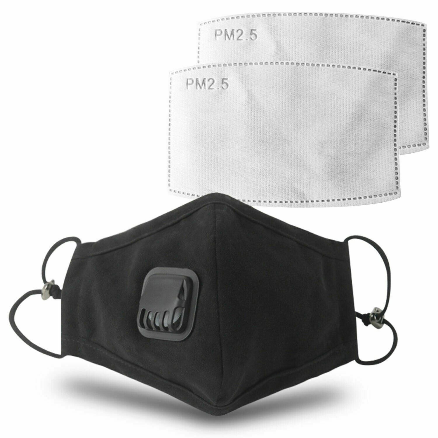 Anti Pollution Washable Cotton Mouth Mask with Valve Replaceable Filter, Black[1x Mask with 2 Filters]