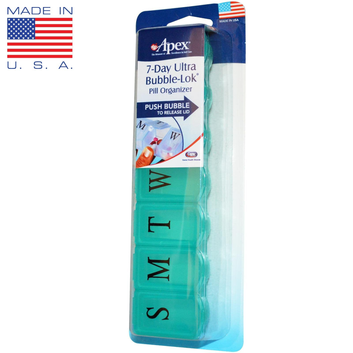 The Measure of Excellence in Self Care Push Bubble to Release Lid Contoured Compartments for Easy Pill Removal! The unique patent-pending design of the 7-Day Ultra Bubble-Lok Pill Organizer features an uncomplicated locking system that simplifies operation and prevents pills from spilling inside your purse, briefcase or suitcase. The lids will not open if the organizer is dropped.