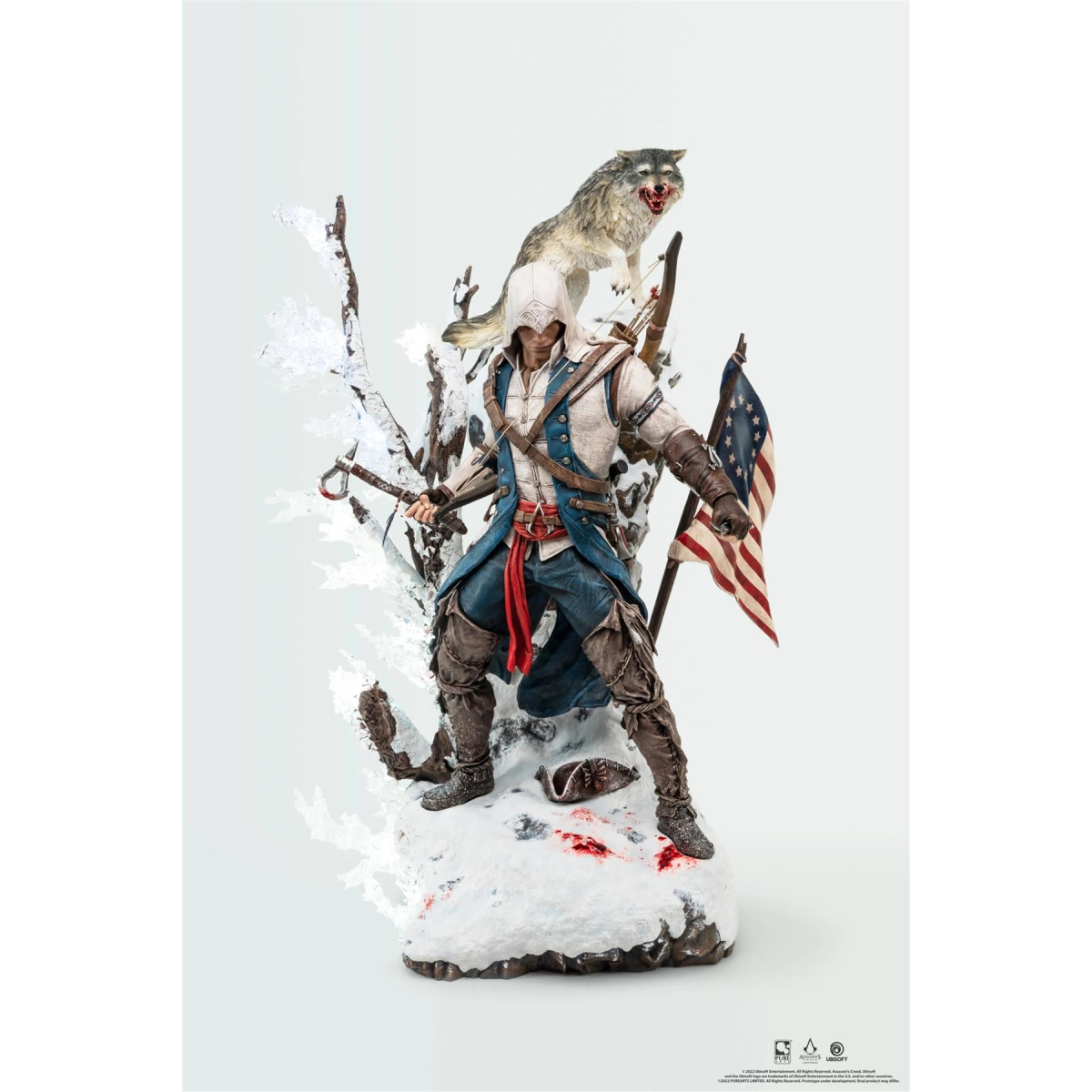 "You reap what you sow." Connor Kenway Young Ratonhnhake:ton learned to master patience and restraint before earning his two Hidden Blades and the title of Assassin Connor Kenway. His campaign now brings him to the esteemed legion of PureArts Animus statues! Our Assassin's Creed: Animus Connor Statue features LED lit animus feature on a snowy rock bluff. In his hand he holds his iconic tomahawk and behind him stands a mystical wolf: his fierce spirit animal. Seventh in the Animus collection, Connor is our most idealistic and endearing Assassin to date! Product highlights: Hyperdetailed sculpt with stunning clothing textures and details LED Animus Effect Fully sculpted 1:4 scale wolf Weapons include his tomahawk, bow and quiver of arrow, saber, and hidden blades. Product details: Licence: Ubisoft Scale: 1:4 Edition Size: 2250 Material: Polyresin Requires 6 AA batteries (not included) Product Size: Qty: 1 statue Height: 25.5 in (65 cm) Width: 17 in (44 cm) Depth: 14.5 in (37 cm) Weight: 9 kg 2022 Ubisoft Entertainment. All Rights Reserved. Assassin's Creed, Ubisoft and the Ubisoft logo are trademarks of Ubisoft Entertainment in the U.S. and/or other countries. 2022 PUREARTS LIMITED. All Rights Reserved. Prototype under development, final product may differ. PLEASE NOTE WE ORDER THE PRODUCT DIRECT FROM THE UK WAREHOUSE SO WE PLACE A LEAD TIME OF 14 DAYS TO RECIEVE THEN THE ITEM IS POSTED/SHIPPED TO THE BUYER