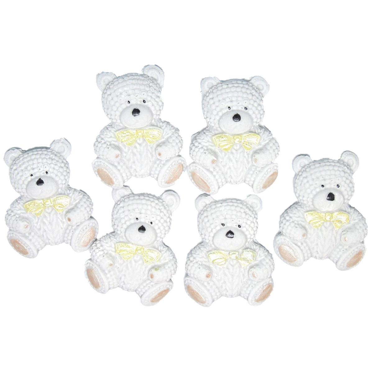 These 6 knitted effect handmade baby teddy cupcake toppers. Vegan, dairy-free, and gluten-free, these adorable edible teddy decorations are perfect for any occasion.