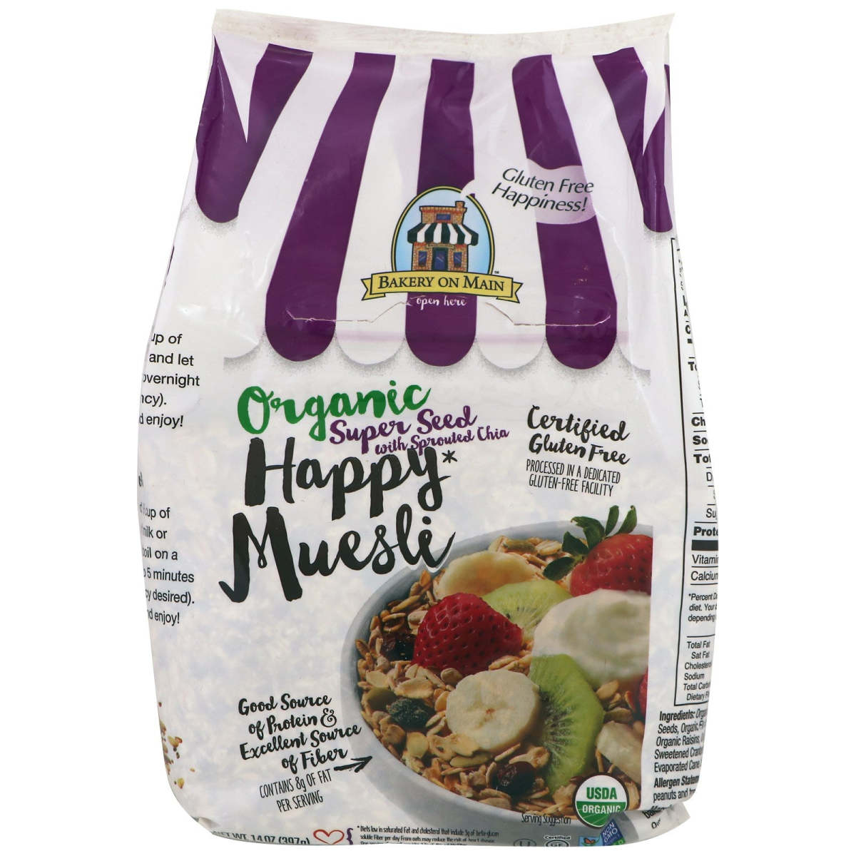 Gluten Free Happiness! Certified Gluten Free Good Source of Protein & Excellent Source of Fiber Contains 8 g of Fat per Serving USDA Non GMO Project Verified Certified by Baystate Certifiers Bakery on Main is bringing you even more Gluten Free happiness with our new Happy Muesli! We strive to use only Audaciously Premium and Clean ingredients in everything we bake, making us proud to offer you this new line of cereal made of delicious and wholesome ingredients. Our Happy Muesli combines Bakeshop Delicious flavors, nutrient-filled grains, protein, and fiber while still honoring this cereal's century-old Swiss roots. It is the perfect start to any day or makes a great pick-me up snack! Now, that's a lot to be happy about! *Diets low in saturated fat and cholesterol that include 3 g pf beta-gluten soluble fiber per day from oats may reduce the risk of heart disease. One serving of muesli provides 1.5 g of this soluble fiber.