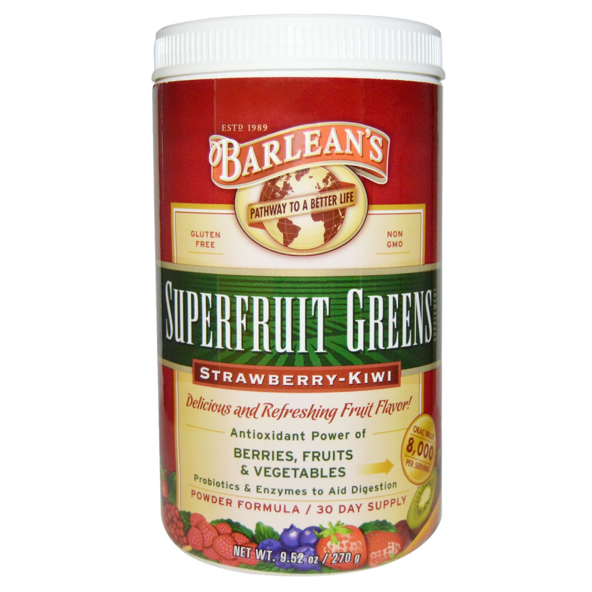 Estd 1989 Gluten Free Non GMO Delicious and Refreshing Fruit Flavor! Antioxidant Power of Berries, Fruits & Vegetables Probiotics & Enzymes to Aid Digestion ORAC Value 8,000 per Serving Powder Formula 30 Day Supply Barlean's New Superfruit Greens are the absolute easiest and most delicious way to fuel your family’s vitality and energy with more than 60 super foods and nutrients. Perfect super-nutrition for the whole family - kids love it! Delicious all-natural Strawberry-Kiwi flavor Mega 8,000 ORAC antioxidant value per serving Perfect replacement for sugar-laden juice and sodas Dairy, Soy & Gluten Free Barlean's Superfruit Greens was Designed to Nutritionally Support: A clean and healthy digestive system Increased energy levels Enhanced mental acuity Balanced pH in the body