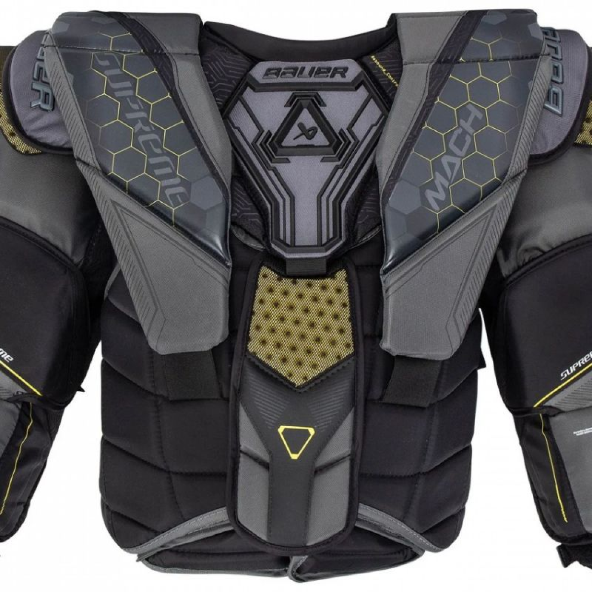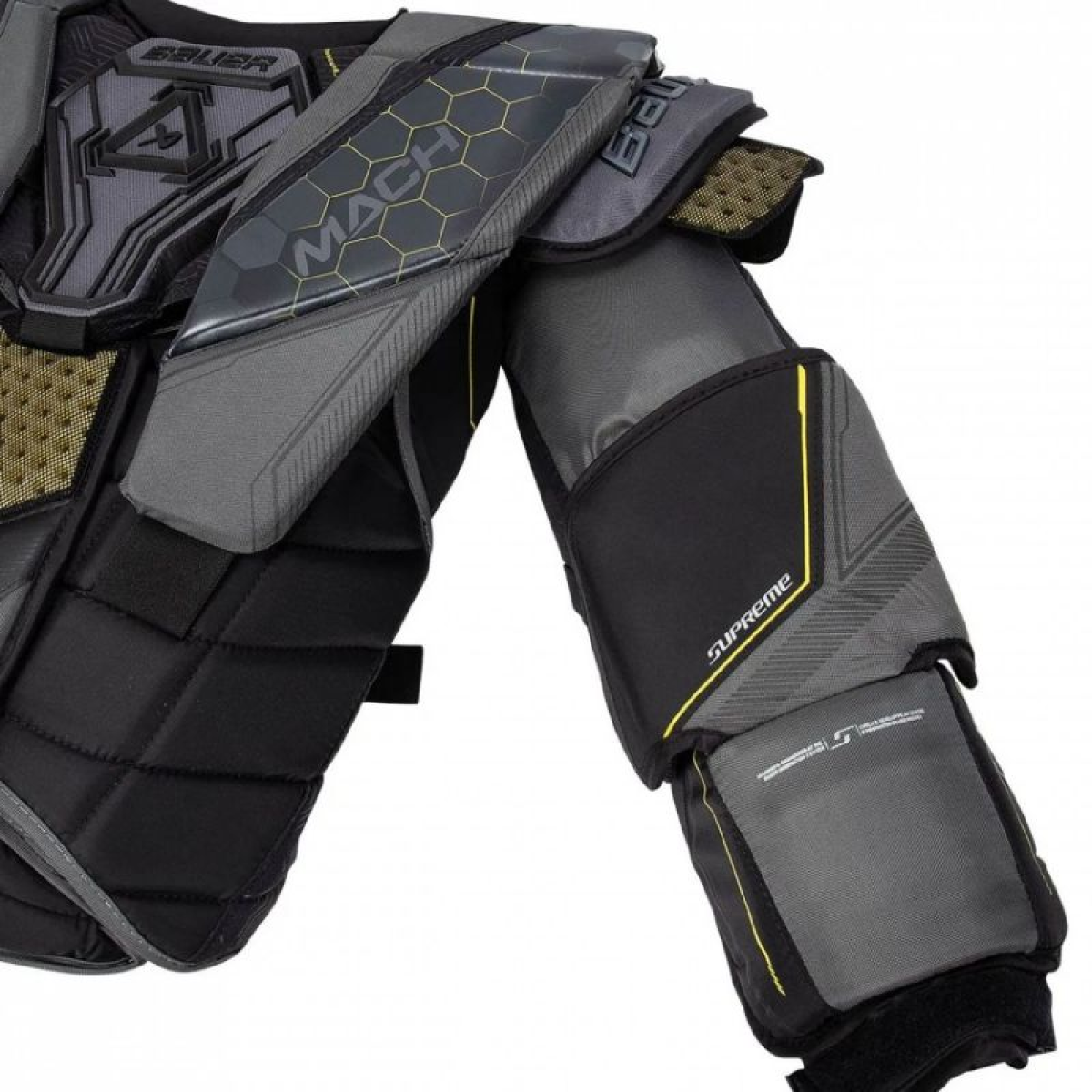 The Bauer Supreme Mach Senior Goalie Vest is the latest version of the iconic Bauer Supreme Mach Senior Goalie line of chest and shoulder protectors. It offers a range of new features and improvements to improve the functionality of previous models. Looking at the front of the Bauer Mach, you'll notice large shoulder pads made of Bauer Shock-Lite Pro material, a super-light and protective material designed to disperse impact. The sternum protector features Bauer's Rebound Control Foam, which provides superior puck absorption to cushion high-speed shots and enhance protection. The movable abdominal blocks are made of Shock-Lite material to provide optimal protection on lower shots. Moving on to the shoulders, Bauer has modernized the system used in the UltraSonic and exponentially improved it for the Mach. The Active Motion Protection (AMP) retention system, originally used in the UltraSonic, has been redesigned as AMP 2.0, offering greater flexibility and protection during movement. Fused Curv Composite material in the biceps and forearms provides unparalleled protection, while the elbow features a Hypersense insert and Shock-Lite foam for excellent weight reduction and protection. Finally, the back of the protector features two collar adjustment points located on the top of the arms. The backplate features a single strap that runs across the goalkeeper's center back, adjustable from one side. Lower down, two separate straps extend to the sides and can be individually adjusted to find the exact fit the goalkeeper wants. Finally, a strap similar to a jersey combat belt can be used to secure the goalkeeper's pants and chest protector. The backplate is made of the brand new THERMOCORE Zero insert with molded foam ventilation to prevent overheating during play. If you're an elite goalkeeper looking for a lightweight chest protector with maximum mobility, this protector is for you.
