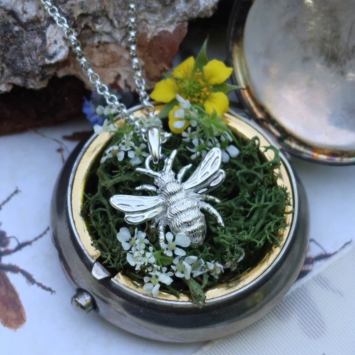 The intricate details of the bee are displayed in this pendant