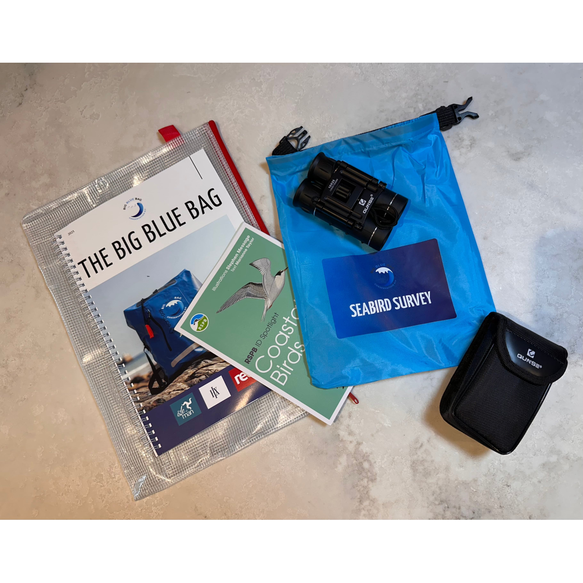 The presence of seabird colonies, of certain species, and their abundance and diversity allows us to assess ecosystem health. The kit contains binoculars, a water proof bag, waterproof notepad, and an approved RSPB Seabird guide.