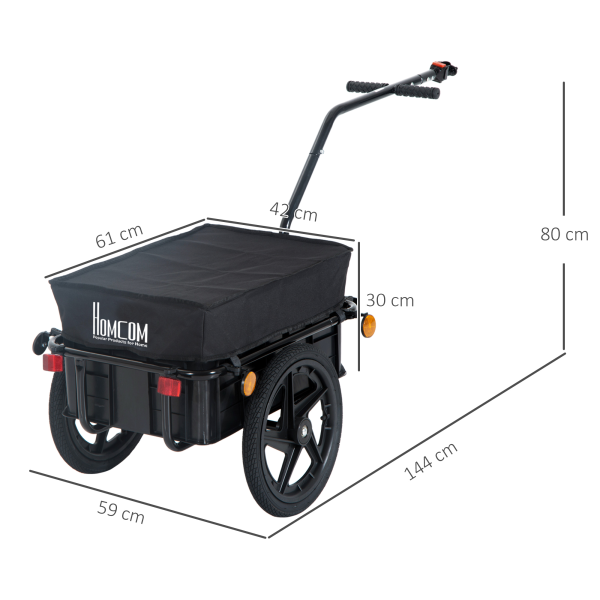 Made from steel tubed frame and oxford cloth Easy attachment to bike Sturdy and stable frame for long term use 600 x 600D oxford cover for rain protection 2 inflatable wheels for smooth movement Removable cargo compartment provides handy storage and organization for your gear Red, yellow and white reflectors for added safety 2 in 1 function Also convenient for pushing if necessary Quick release design between chuck and tow bar
