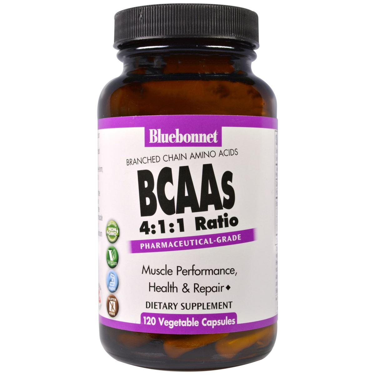 Pharmaceutical-Grade Muscle Performance, Health & Repair Made with Non GMO Ingredients Vegan Kosher Parve Gluten Free AjiPure Amino Acids Dietary Supplement Bluebonnet's BCAAs Capsules provides free-form, pharmaceutical-grade, anabolic amino acids (L-leucine, L-isoleucine and L-valine) from Ajinomoto, the world-class quality leader in the production and purity of amino acids. These vegetarian-sourced BCAAs are provided in the scientifically supported 4:1:1 ratio for peak muscle performance, health and repair. Available in easy-to-swallow vegetable capsules for maximum assimilation and absorption.