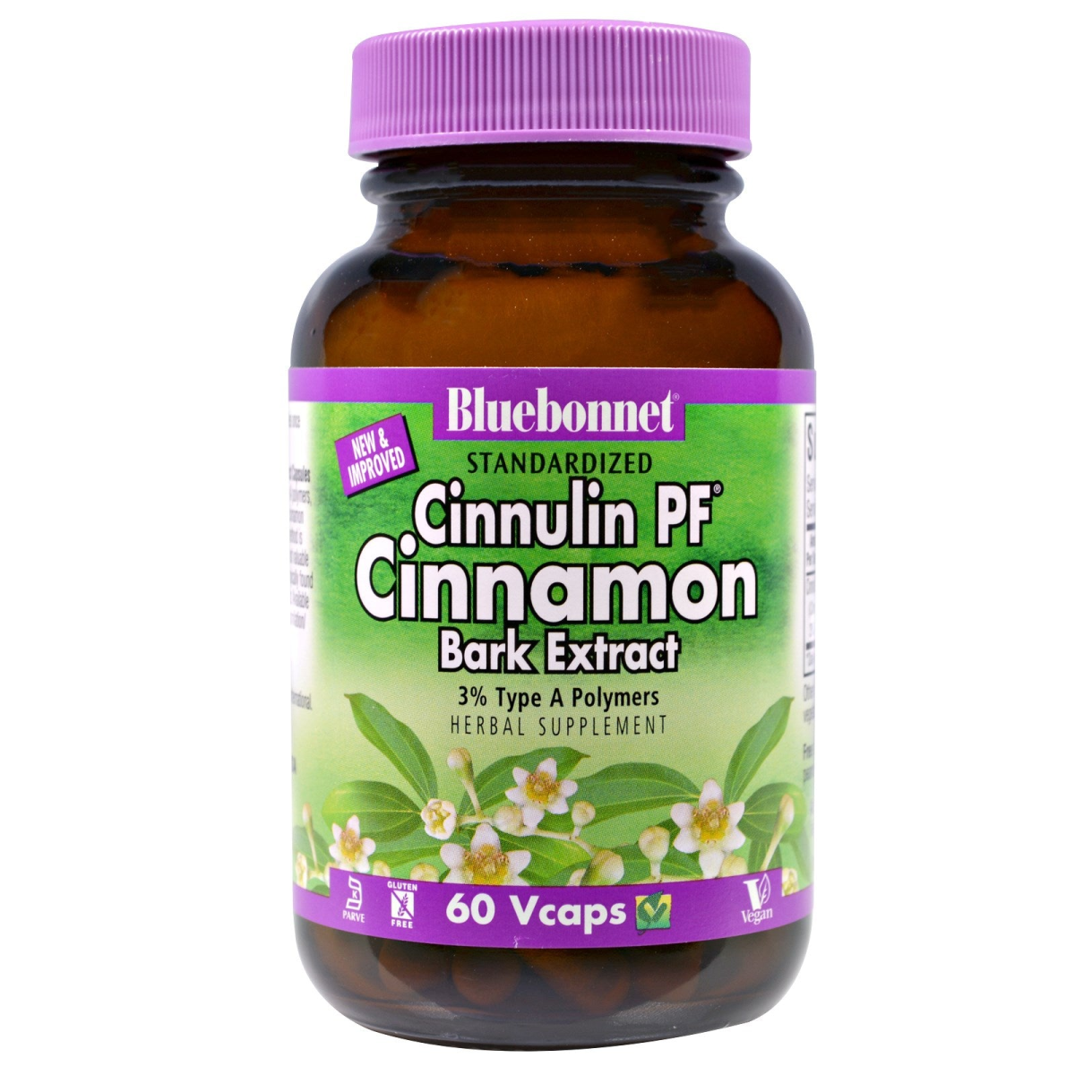New & Improved Standardized 3% Type A Polymers Herbal Supplement Kosher Parve Gluten Free Vegan Sustainably Harvested Bluebonnet's Standardized Cinnulin PF Cinnamon Bark Extract Capsules provide a standardized water-soluble extract of type A polymers, the most researched active constituents found in cinnamon bark. A clean and gentle water-based extraction method is employed to capture and preserve cinnamon's most valuable components while eliminating toxic compounds typically found in whole cinnamon and fat-soluble cinnamon extracts. Available in easy-to-swallow vegetable derived capsules for maximum assimilation/absorption and for a truly vegetarian/vegan formula.