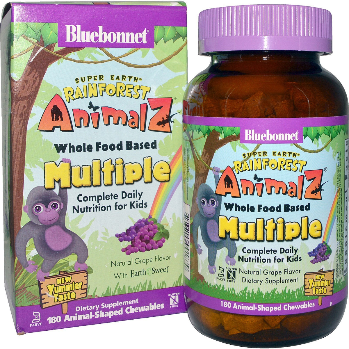 Super Earth Rainforest AnimalZ Complete Daily Nutrition for Kids New Yummier Taste With EarthSweet Dietary Supplement Kosher Parve Animal-Shaped Chewables Gluten Free KOF-K Kosher Certified If children grew up in the rainforest, they'd get most of the nutrients for proper growth and development from whole foods like fruits, vegetables, whole grains and fish. Nutrients that are often missing from today's diets. Bluebonnet's Super Earth Rainforest Animalz Whole Food Based Multiple helps bridge this nutrient gap, providing important vitamins, minerals, super fruits and vegetables in two yummy animal-shaped chewables. Bluebonnet's Super Earth Rainforest Animalz Whole Food Based Multiple Animal-Shaped Chewables contain: Select Albion chelated minerals, the more absorbable/bioavailable mineral form More absorbable forms of select B-vitamins EarthSweet Natural Sweetener A nourishing blend of fruit juice concentrates and natural cane crystals