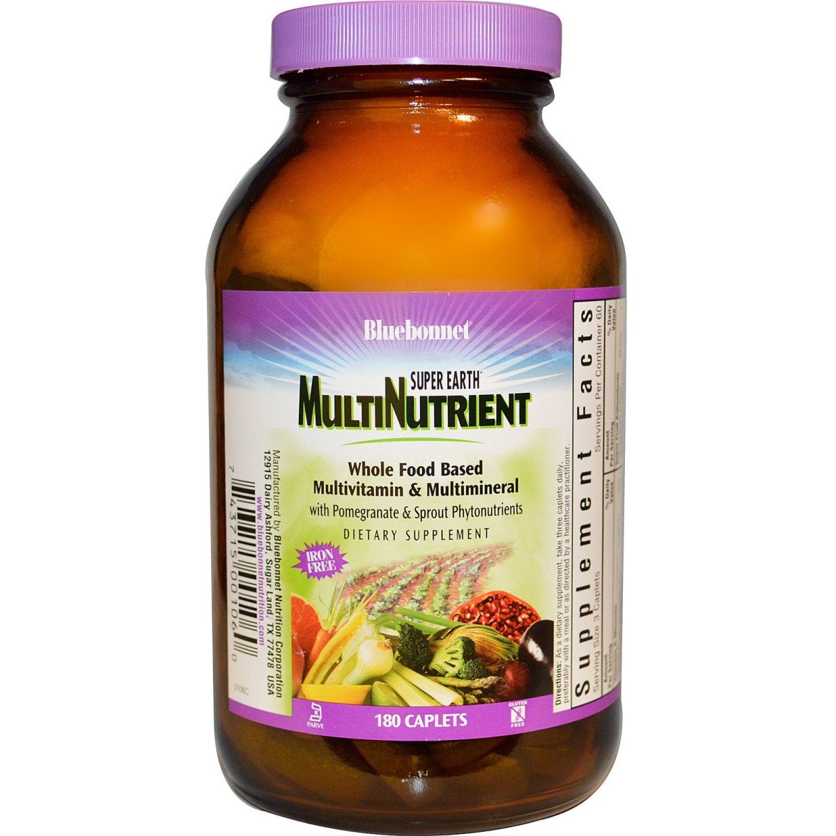 Whole Food Based Multivitamin & Multimineral With Pomegranate & Sprout Phytonutrients Dietary Supplement Kosher Parve Gluten Free Bluebonnet's Super Earth Multinutrient Formula Caplets is a whole-food based multivitamin & multimineral dietary supplement that is 100% gluten-free, enriched with super whole food concentrates, as well as providing a perfect blend of plant source nutrients, plant oils, herbs, vitamins, minerals, antioxidants, enzymes and a phytonutrient sprout blend. Available in easy-to-swallow mini-caplets or caplets for maximum assimilation and absorption.