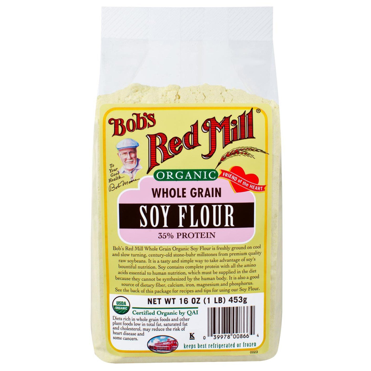 To Your Good Health...Bob Moore 35% Protein Friend of the Heart Kosher USDA Certified 100% by QAI Bob's Red Mill Whole Grain Soy Flour is freshly ground on cool and slow turning, century-old stone-buhr millstones form premium quality raw soybeans. It is a tasty and simple way to take advantage of soy's bountiful nutrition. Soy contains complete protein with all the amino acids essential to human nutrition, which must be supplied in the diet because they cannot be synthesized by the human body. It is also a good source of dietary fiber, calcium, iron, magnesium and phosphorus. Our product line is diverse and extensive. Diets low in saturated fat and cholesterol that include 25 grams of soy protein a day may reduce the risk of heart disease. One serving of Soy Flour provides 10 grams of soy protein.