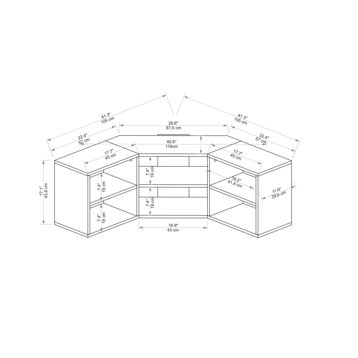 TV Stand HEIGHT: 17.1" / 43.5 cm | WIDTH: 58.4" / 148.5 cm | DEPTH: 11.6" / 29.6 cm.