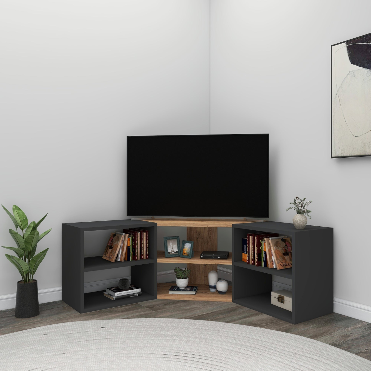 Elevate your TV viewing experience with this corner TV stand entertainment centre. Designed for corner use, this modern stand can accommodate flat-screen TVs up to 50 inches. With 6 spacious shelves for storage, you can keep your media essentials organized. Made of high-quality particleboard and a water-resistant surface, this stand offers both durability and style. Upgrade your entertainment space.