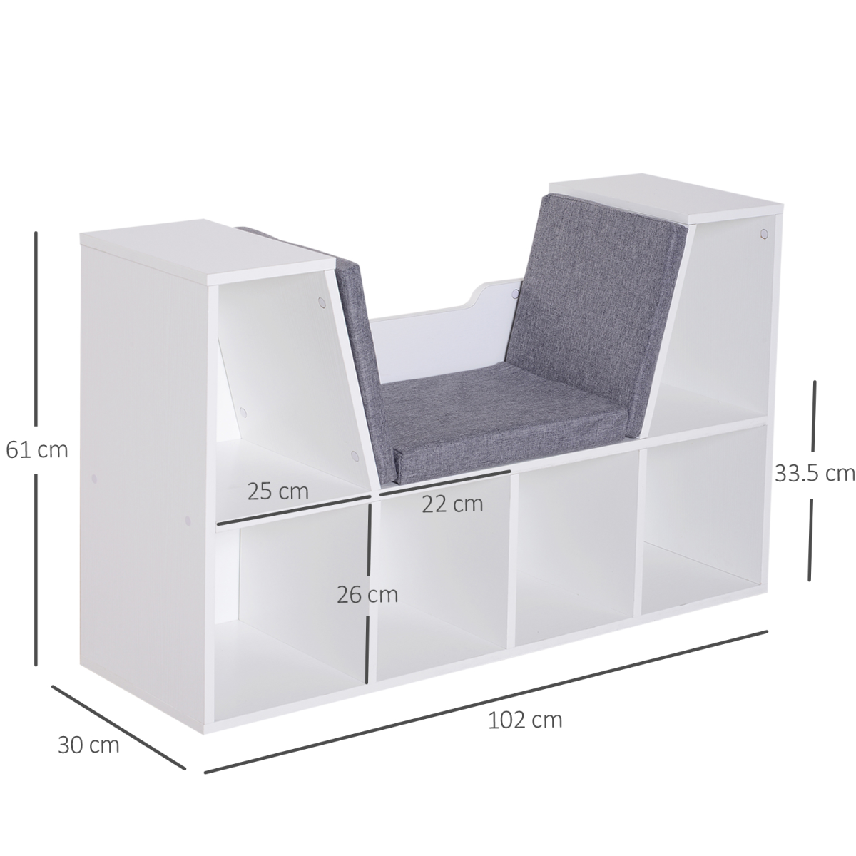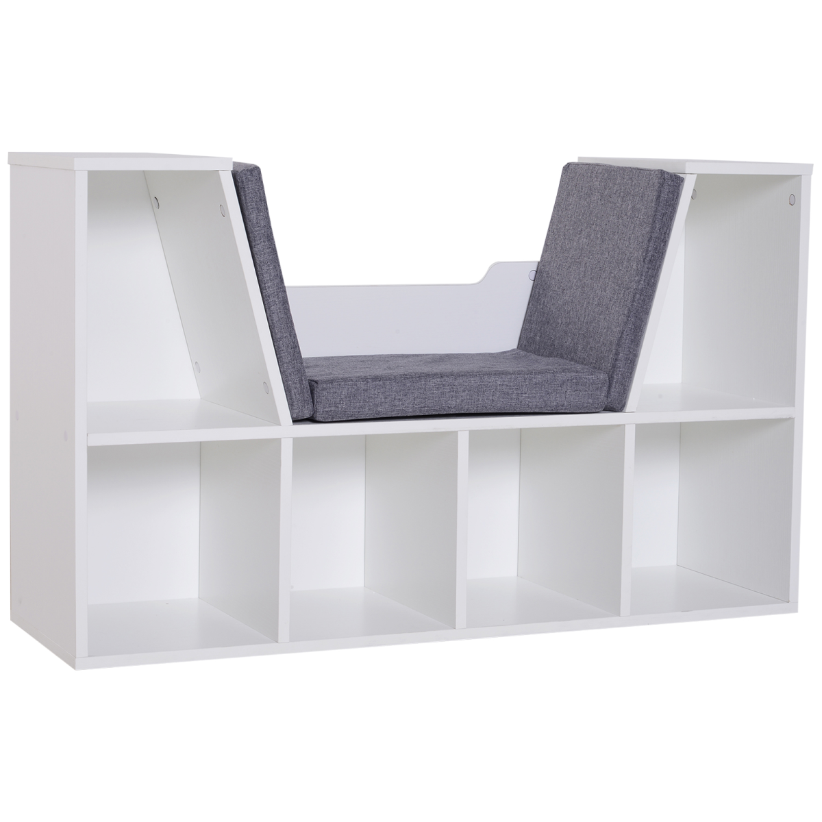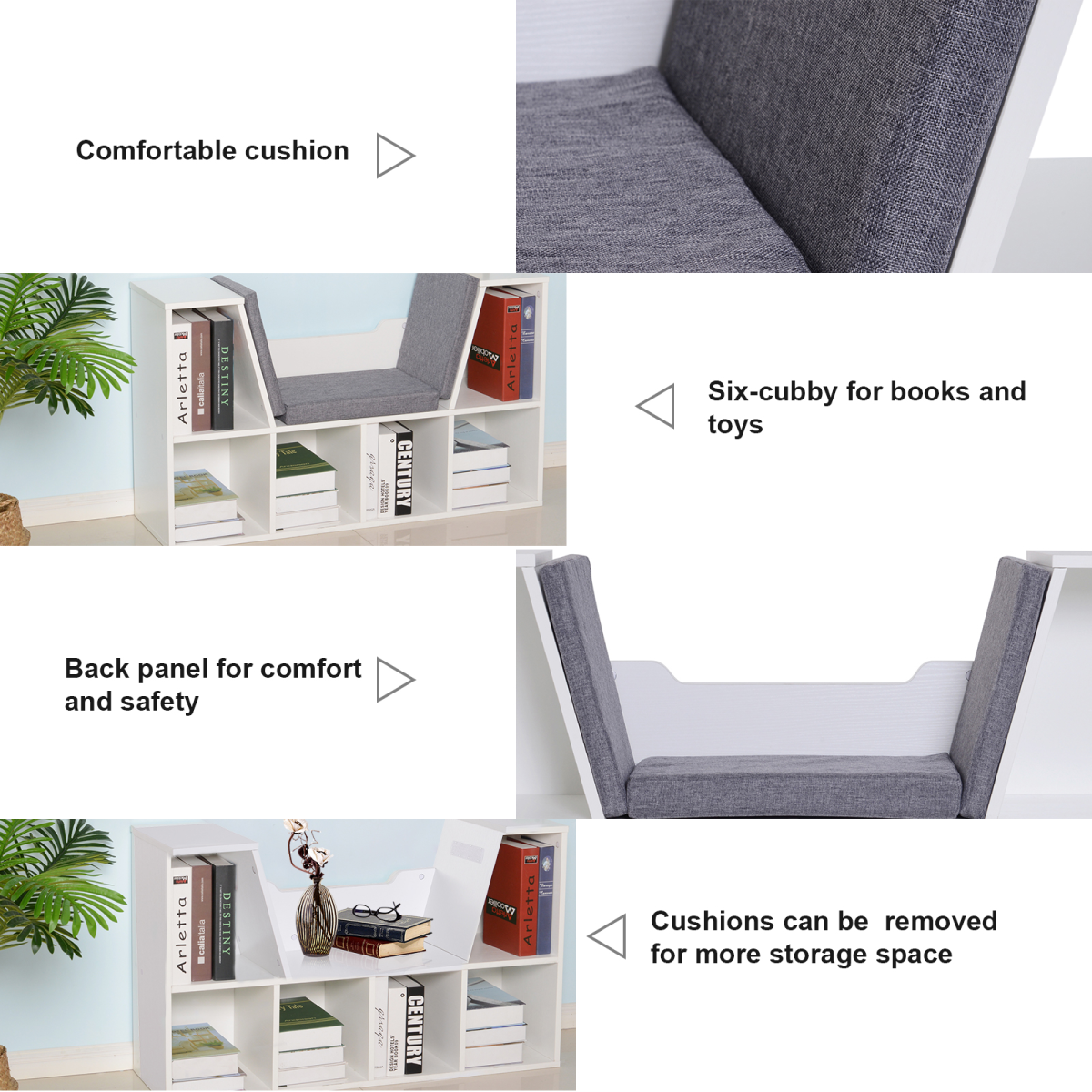 Unique design combining a seat with a bookshelf/storage unit Sturdy particle board construction in a smooth and sleek white finish Plush padded foam seat and back cushions for continual comfort sitting Cushions can be removed to allow more storage space Spacious design featuring six storage cubes and two top wooden shelves Perfect for kids and adults Assembly required