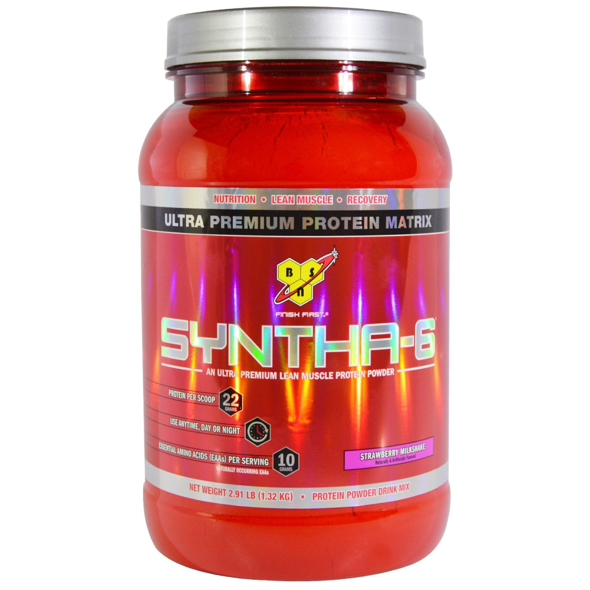 Nutrition Lean Muscle Recovery Ultra Premium Protein Matrix Finish First An Ultra Lean Muscle Protein Powder Protein Per Scoop - 22 Grams Use Anytime, Day or Night Essential Amino Acids (EAAs) Per Serving -10 Grams Naturally Occurring EAAs Naturally & Artificially Flavored Ultra-Premium Protein. Ultra-Premiun Taste Syntha-6 Product Highlights: Multi-Functional Ultra-Premium Protein Matrix Naturally Occurring BCAAs and other Essential and Non-Essential Amino Acids MCTs, EFAs, and Glutamine Peptides Excellent Source of Fiber. Contains 6 g of Fat per serving Zero Milligrams of Aspartame Designed For: Any individual who wants an ultra-premium protein powder to help them reach their nutritional and physique goals. Lecithin is a phospholipid complex derived from soybean oil, which is used to promote mixability. This product has been manufactured by a Good Manufacturing Practices (GMP) facility.