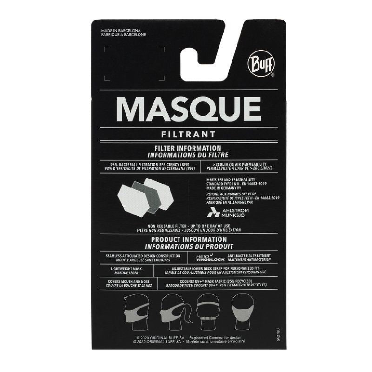 The new BUFF® filter mask is designed to provide comfort while maintaining a filter efficiency of 98%. Elastic straps at the back of the head allow for a secure fit and prevent pressure around the ears.