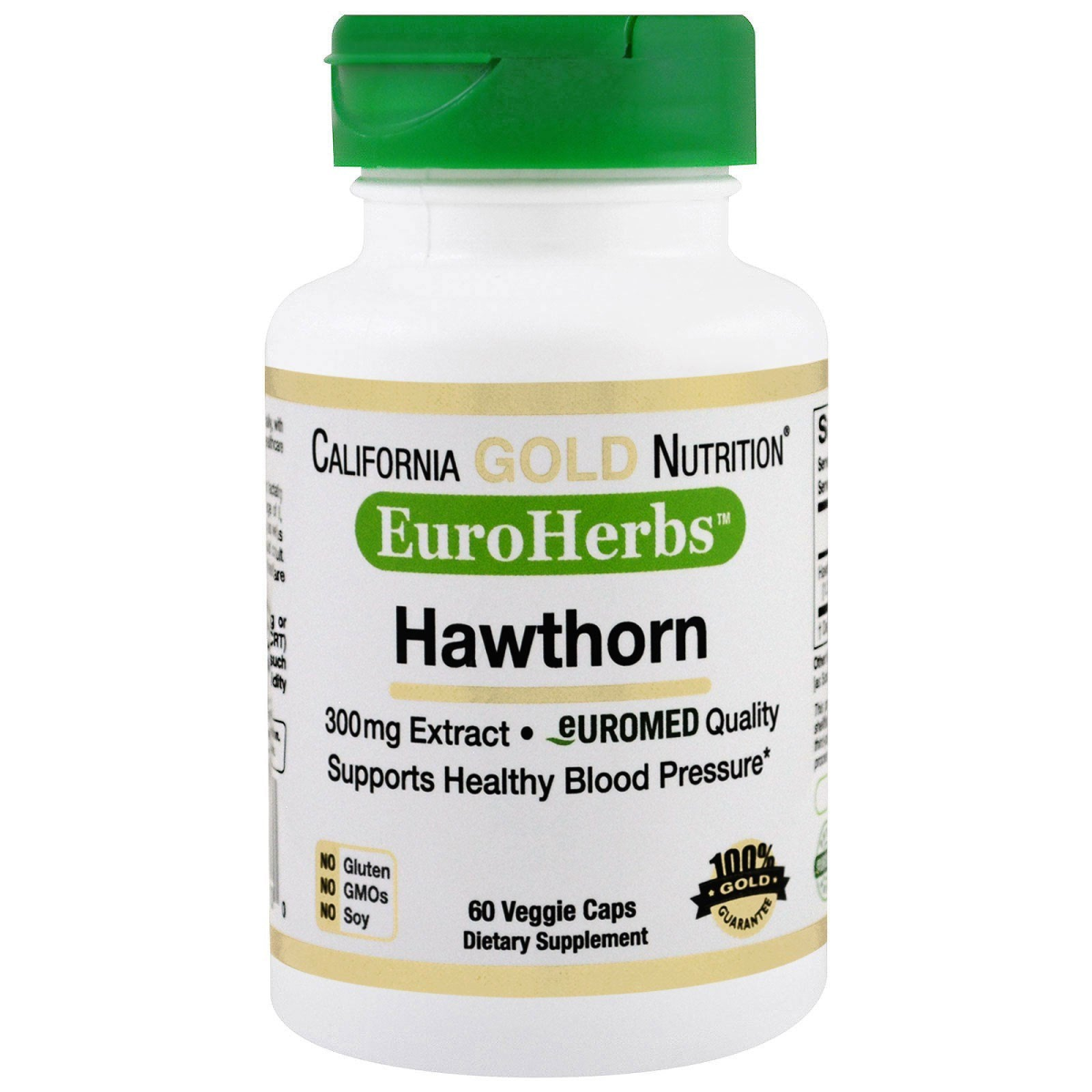300mg Extract Hawthorn Origin (EU) – Processed in Spain EuroMed Quality – Phyto Proof Supports Healthy Blood Pressure* Suitable for Vegetarians No Gluten No GMOs No Soy Green Veggie Caps Colored with Chlorophyll No Artifical Colors A Dietary Supplement 100% Gold Guarantee EuroHerbs™ is a unique line of premium quality herbals that are sourced and processed from two of the finest European Herbal Manufacturers in the world. Country of Origin and Country of Processing is disclosed for each of our herbal products. Hawthorn is a flowering shrub that may help support healthy blood pressure levels.* Hawthorn is native to northern Europe and contains phytonutrients that are considered powerful antioxidants. The leaves and blossoms contain compounds that have been shown to support a healthy vascular system.* Each veggie capsule contains Hawthorn leaf and flower extract standardized to 1.2% Hyperoside and 1.8% Vitexin. Green Veggie Caps - Naturally colored with Chlorophylln- green pigment found naturally in plants, sourced from alfalfa and mulberry leaves Learn More about EuroMed Quality – Phyto Proof: EuroMed Quality Hawthorn Extract What is Phyto Proof Identity? What is Phyto Proof Potency? California Gold Nutrition® Certificate of Analysis
