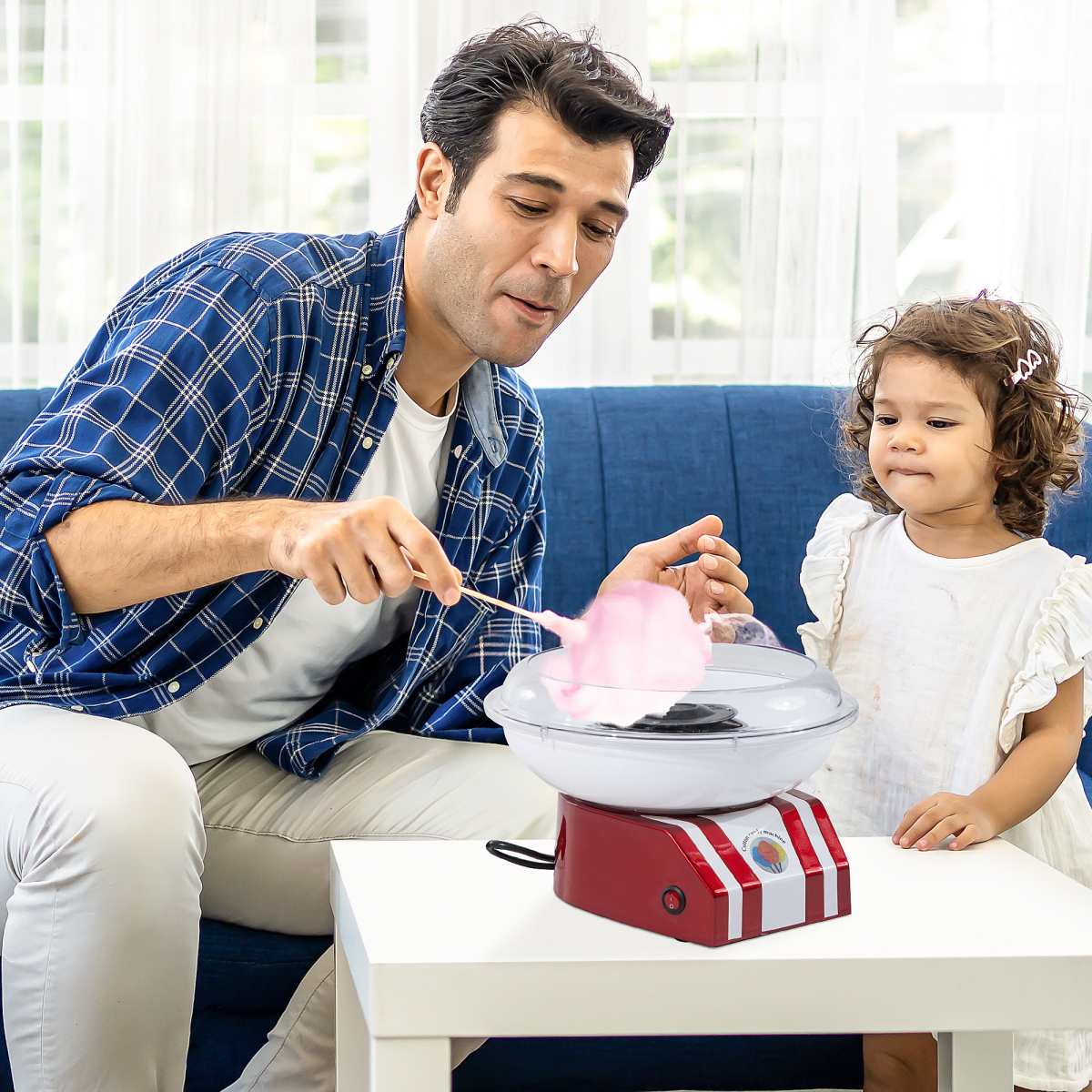 Made of high quality stainless steel, durable Easy operation with a quick on and off switch High production, one candy floss is formed in short time Energy saving Ideal for home use at many events for fun or tasty 1 stainless steel tube for heating usage Anti-slip feet at bottom With 10 bamboo sticks, stainless steel cover, aluminum turntable Lightweight, ease to transport Certified by CE