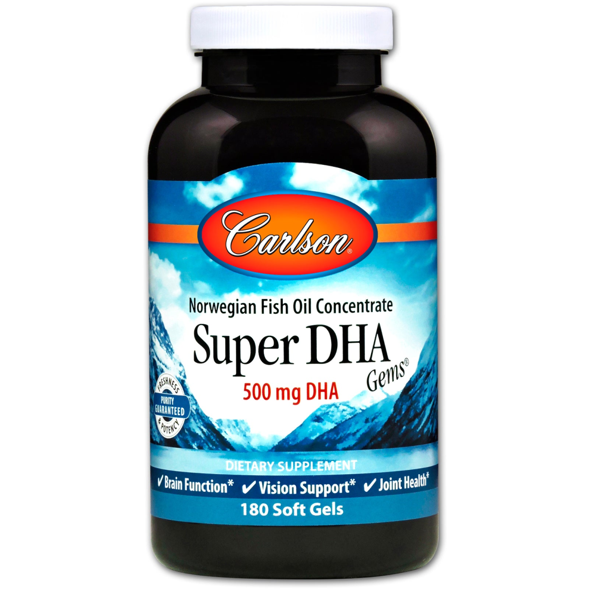 Norwegian Fish Oil Concentrate 500 mg DHA Purity Guaranteed - Freshness & Potency Dietary Supplement Brain Function Vision Support Joint Health Carlson Providing the Finest Norwegian Omega-3s Since 1982 An FDA Regulated Facility Gluten-Free No Artificial Preservatives Friend of the Sea Super DHA Gems provide the beneficial omega-3 DHA, which plays an important role in vision health. DHA is prevalent in the retina, and the cells that make vision possible have more DHA than any other cells in our body. Provide optimal support for healthy eyes and vision with Super DHA Gems.