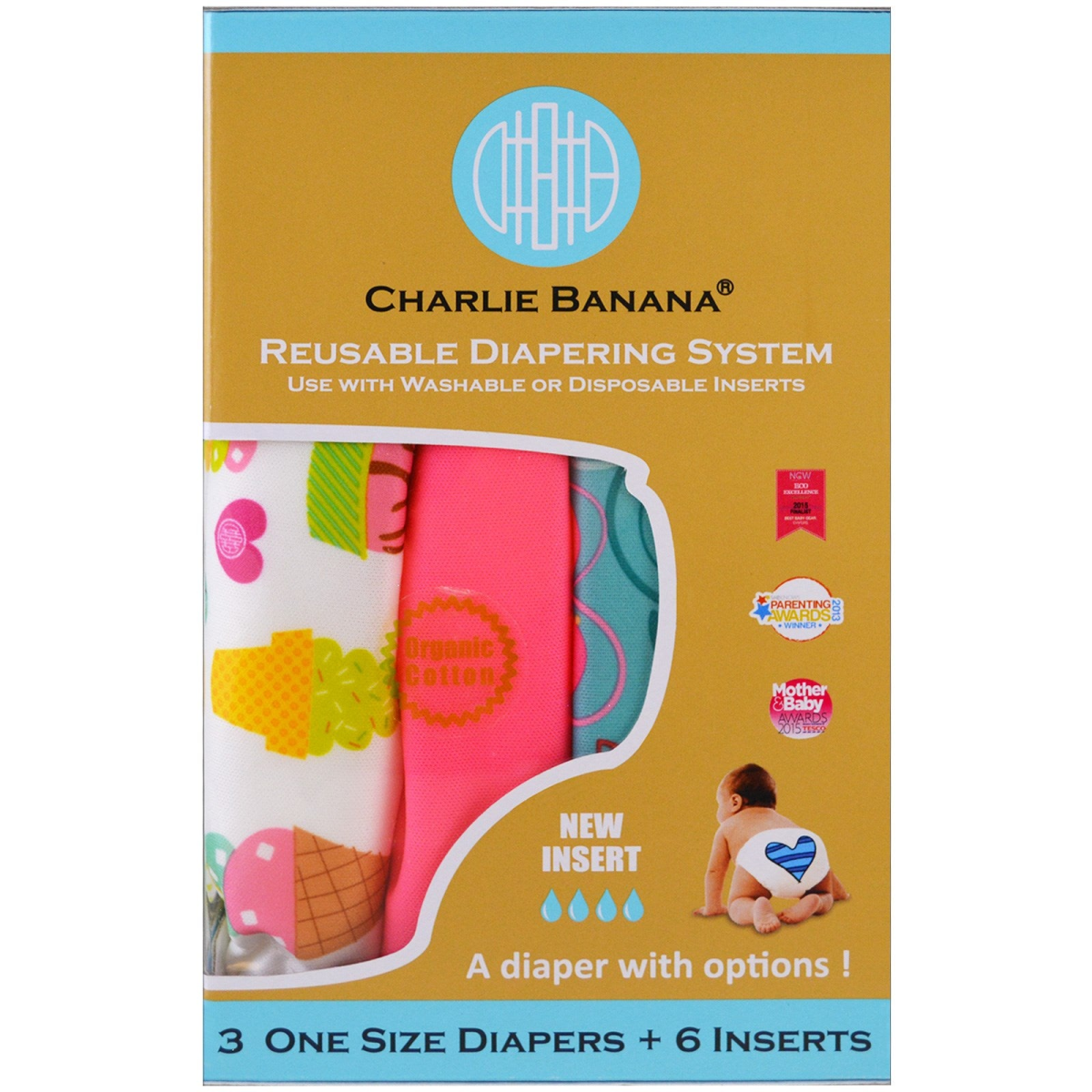 Charlie Banana, Reusable Diapering System, One Size Diapers, Girl, 3 Diapers + 6 Inserts