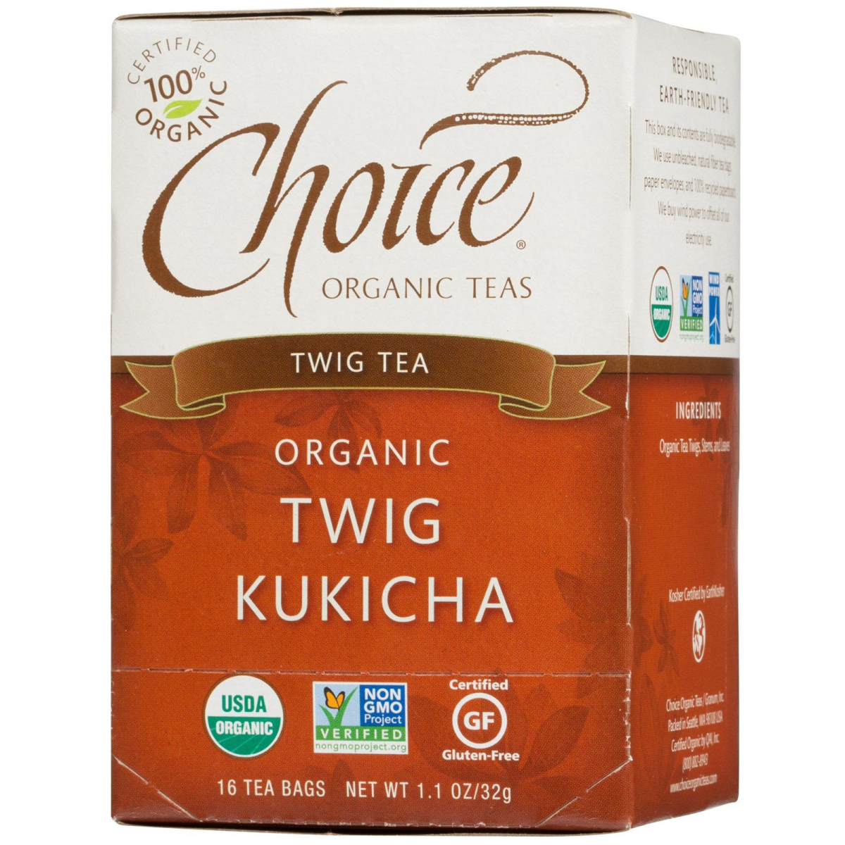Teas Certified 100% Twig Tea USDA Non GMO Project Verified Certified Gluten-Free Kosher Certified by EarthKosher Certified by QAI Purifying Restore your inner harmony with this delicious, traditional Japanese cup made from tea twigs and stems. They're carefully aged and slowly toasted to create a full-bodied taste that's slightly creamy with sweet, nutty undertones. Naturally low in caffeine, this purifying tea may be enjoyed any time of day. Tea Origin - Japan Perfectly Balanced Tea Since 1989, our mission has been to improve the world one cup of tea at a time. As the first exclusively tea crafter in the United States, and later, the first to offer Fair Trade Certified tea, we craft the world's finest teas with conservation of the planet and its creatures in mind. Let's chat over a cuppa. Savor Every Moment There's so much good in a cup of tea. It clears our mind and boosts our spirits. Tea brings us closer to friends and family looking to share the day's stories and it connects us to all those around the globe who cherish this timeless ritual. Whether it's a hearty mug that gets your morning started, or a relaxing cup that helps you unwind and reflect on your day, we thank you for enjoying Choice Teas.