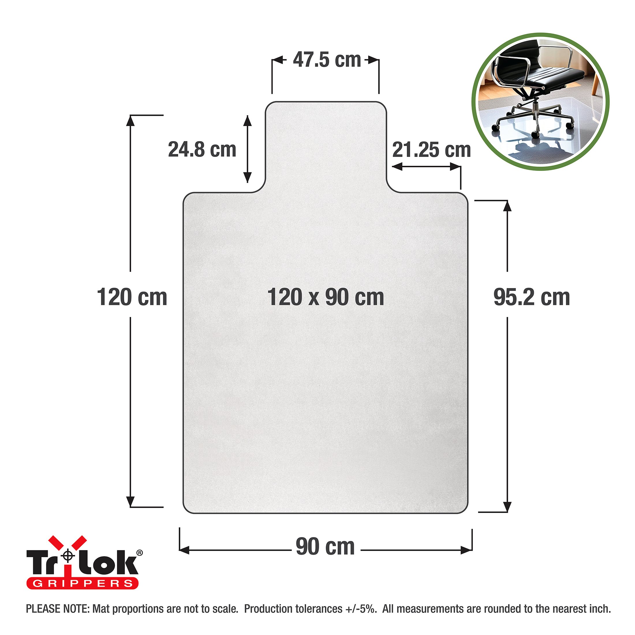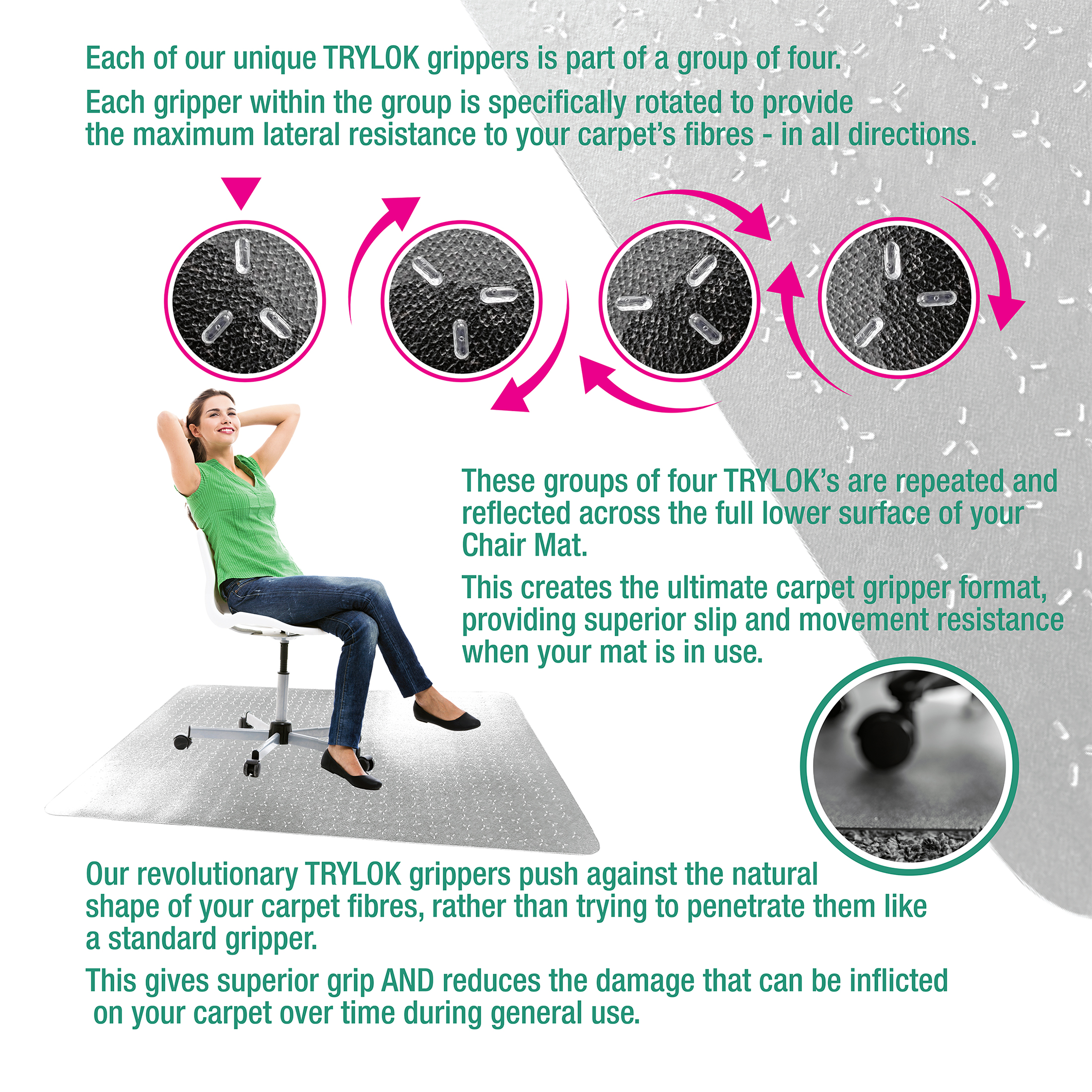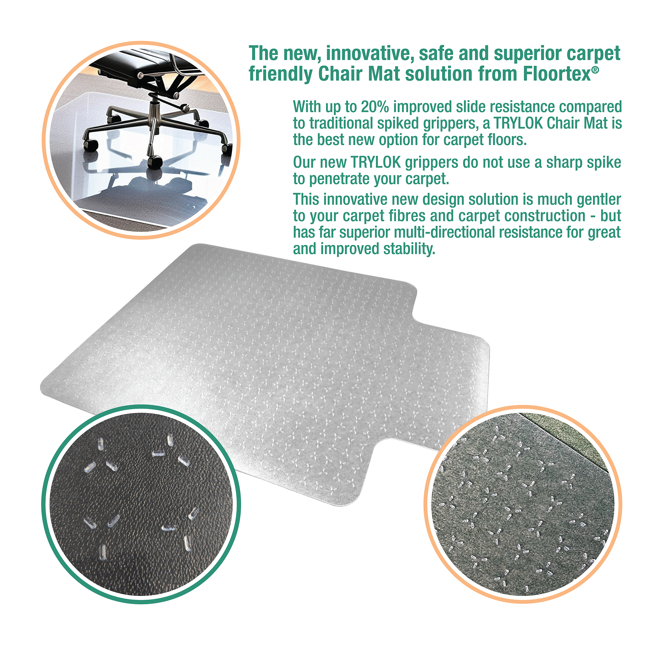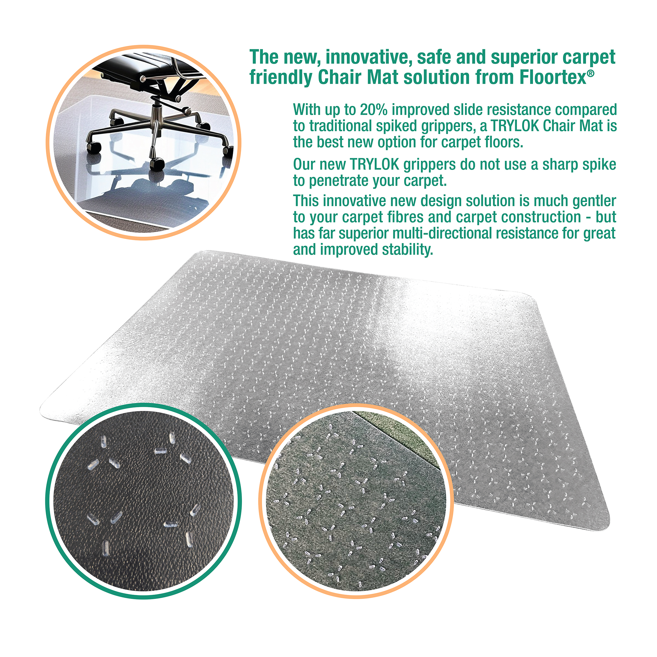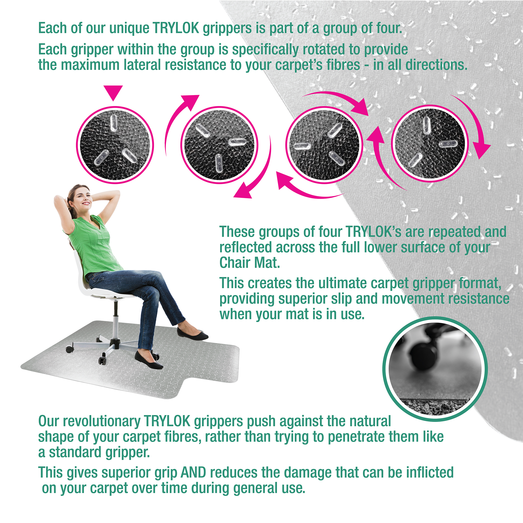 Cleartex® TrYlok® chair mats provides a high quality and durable solution for floor protection and ergonomics. Incorporates our New TrYlok® stability system multi-directional cleats for ultimate stability on carpeted floors. Provides up to 20% improved slide resistance compared to traditional spike grippers. Will not to crack, chip, break or shatter under normal use and correct application. 100% free of harmful DIDP Phthalate content for improved air quality over conventional PVC products. Cadmium, tin and lead & BPA free. Free of SVHC (Substances of Very High Concern) for peace of mind when used around children or pets. Manufactured using renewable energy from solar power. Contains up to 20% recycled content. 100% recyclable. 20 Year Limited Warranty.